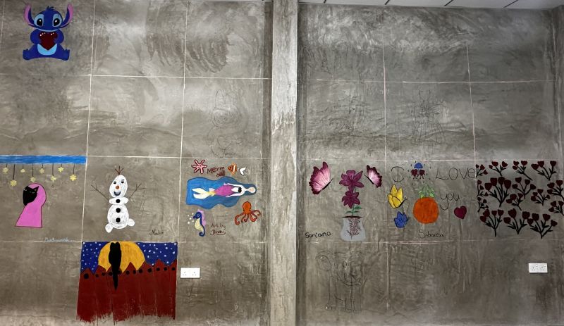 Die Mädchen haben gerade Ferien und ihr TV Raum sieht im Moment noch etwas grau aus. Es braucht ein wenig Farbe. Jedes Kind bekommt ein eigenes Quadrat an der Wand und darf sich dort kreativ austoben.