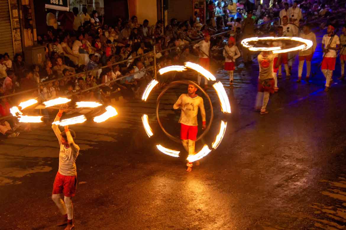 Tanzgruppen präsentieren verschiedene Formen des traditionellen sri-lankischen Tanzes wie Kandyan-Tänze, Feuertänze und Peacock-Tänze, die jeden Betrachter in ihren Bann ziehen. Die pulsierenden Trommelrhythmen der Trommler, die in traditionellen weißen Gewändern gekleidet sind, hallen durch die Straßen und versetzen das Publikum in einen hypnotischen Zustand.
