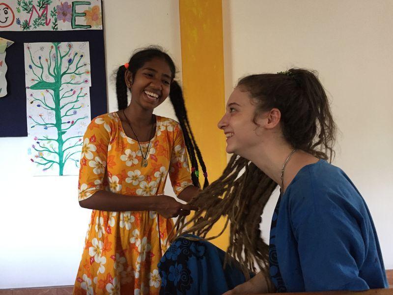 Da meine Haare super lang, dick und schwer sind habe ich diese fast immer zu einem Knoten zusammengebunden und trage einen Turban, alles andere wäre bei der Hitze auf Sri Lanka nicht zu ertragen. Das macht die Mädchen noch viel interessierter, sie fragen ständig ob ich meine Haare nicht bitte öffnen und zeigen könne. Die Erfahrung, dass gleich so viele Menschen auf einmal Fragen zu meinen Haaren haben, sie sehen und fühlen wollen ist auch für mich ganz neu. Zuhause in Deutschland, vor allem in Freiburg ist das mittlerweile etwas völlig normales, kaum einer schaut mich dort noch überrascht an. Hier und da haben auch die Leute in der Heimat Fragen, zum Beispiel wie ich meine Haare waschen, pflegen oder öffnen kann.
