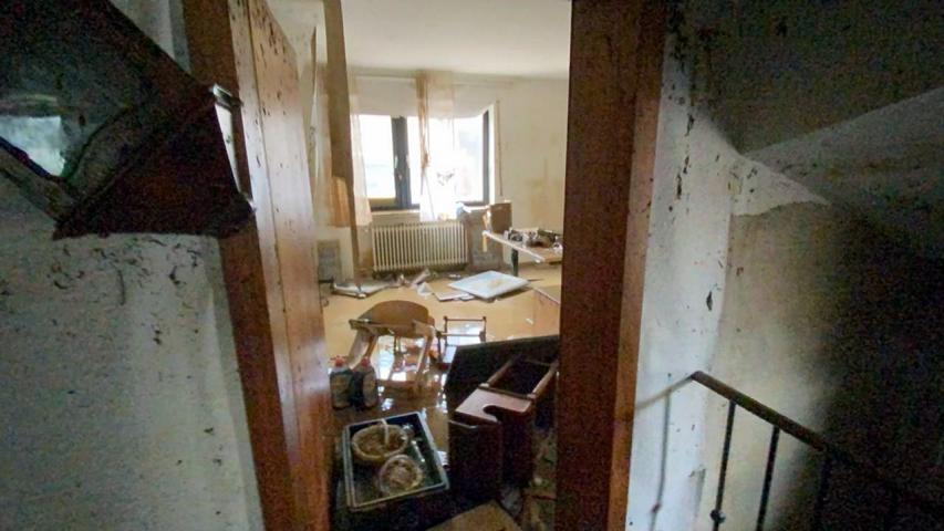 "Die Familie war zum Zeitpunkt der Flut zu Hause und konnte sich Gott sei Dank auf den Dachboden retten. Das Haus wurde jedoch so schwer getroffen, dass der Schlamm und das Wasser bis in die 2.Etage drangen. Beschädigt wurde auch der Tank der Heizung und das Heizöl verteilte sich im gesamten Haus. Wände und Böden wurden durchtränkt und wurden inzwischen für ein Gutachten teilweise freigelegt. Der Geruch im Haus ist entsprechend. In einigen Tagen wird ein Sachverständiger prüfen, ob das Haus erhalten werden kann.