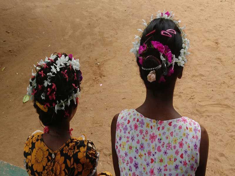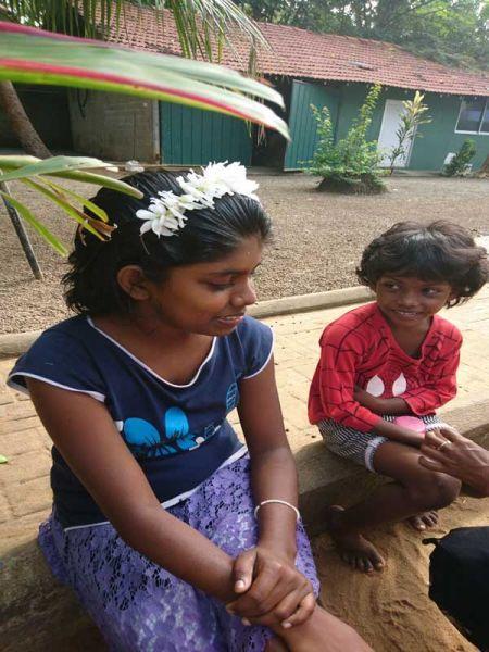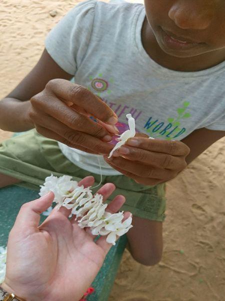…Uns war natürlich im Vornherein bewusst, dass das blumige Frisieren zu einer der Lieblingsbeschäftigungen unserer Mädels gehört. Aber der Elan und die Kreativität, die sie hier nochmals zum Ausdruck brachten, versetzte uns doch in ein kleines, glückliches Staunen. 😊 So kamen ein paar der Mädels auf die Idee, Blumen mit einer Nadel auf Garn einzufädeln, um diese anschließend den Mädchen mit kürzeren Haaren um den Kopf zu binden. 😊 Zu einer dieser Mädels zählt unsere Gayani. Bei ihr war es allerdings mit der üppigen „Beblumung" auf ihren Haaren nicht genug, eine Blumen-Halskette durfte nicht fehlen.