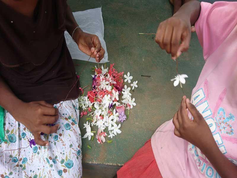 In den meisten Gruppen ließ sich eine ähnliche Aufgabenverteilung erkennen: Die größeren Mädchen waren eher fürs Flechten zuständig, während die Kleinen für die frische Blütenzufuhr sorgten.
