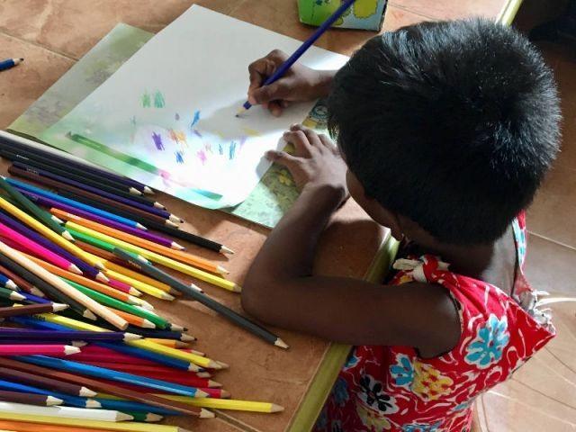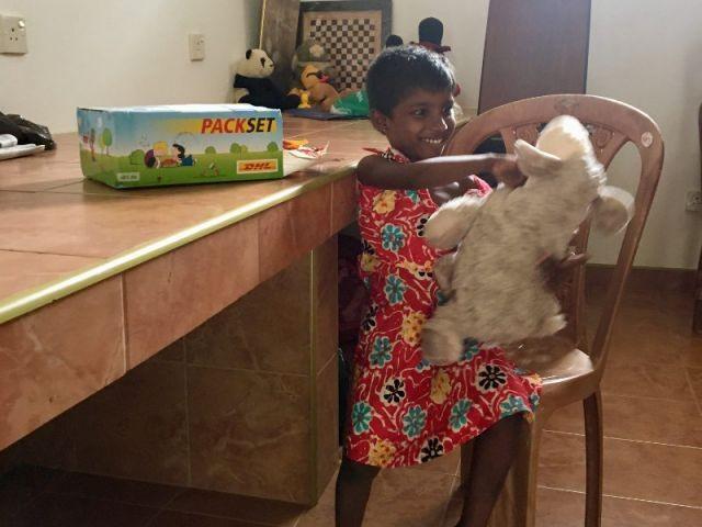 Ein flauschiges Kuschelschaf zieht Aruni als erstes aus dem Paket und drückt es ganz fest an sich. Danach präsentiert sie uns stolz, was sie noch alles bekommen hat. Dabei ist sie dauerhaft am Grinsen. Auch beim Malen der Dankeskarte hat sie viel Spaß und gibt sich ungeheuer Mühe.