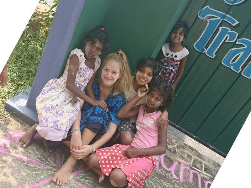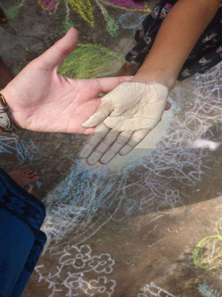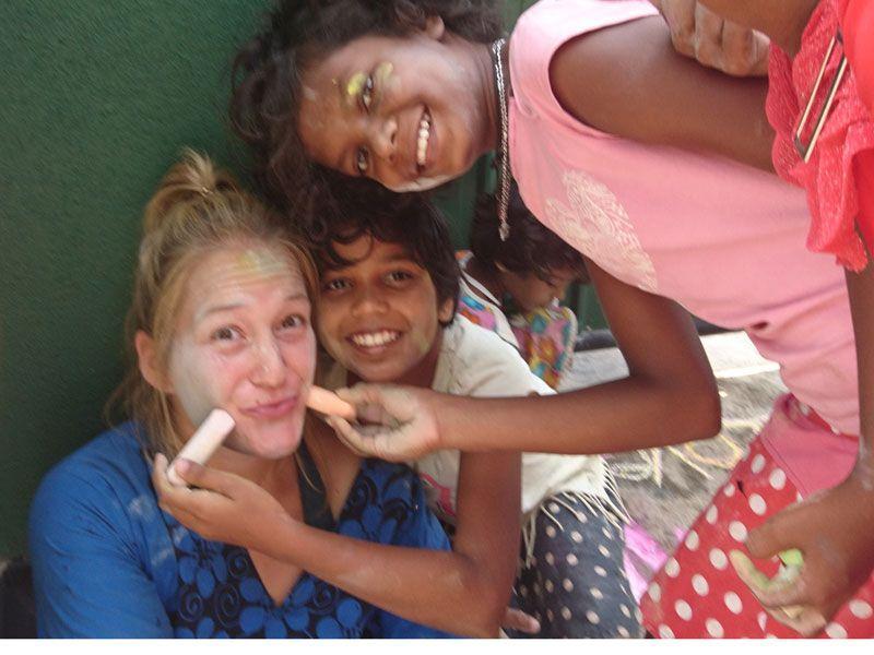 Kaum setzte ich mich zu Minushi um das bunte Treiben in Ruhe zu beobachten, schon war es mit der Ruhe vorbei. Denn Kumari lief laut lachend zu mir und strich mir wild mit ihren „Kreidehänden" über mein Gesicht. Vishmi machte es ihr nach und strich die bunte Kreidefarbe über meine Wangen. Abschließend bekam ich noch Farbe von Vishmi, Madushani, Sasini und Nethmi, so dass auch wirklich keine Stelle meines Gesichtes mehr frei war. In dem Moment, als ich Madushanis Hände spürte, hörte ich einen fröhlichen „Happy Holi!" - Zuruf von ihr! Und schon befand ich mich inmitten eines originalen Festes der Farben – wie schön! 😊
