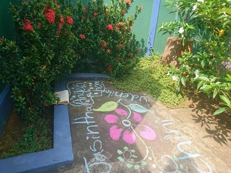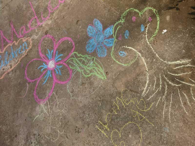 Auch unsere Matrons (Erzieherinnen) waren wieder live dabei und ließen es sich nicht nehmen, ihren Teil zum Straßenkunstwerk beizusteuern. Jacintah malte einen pinken Pfau und von Sandamali stammen die großen, gelben Blüten.