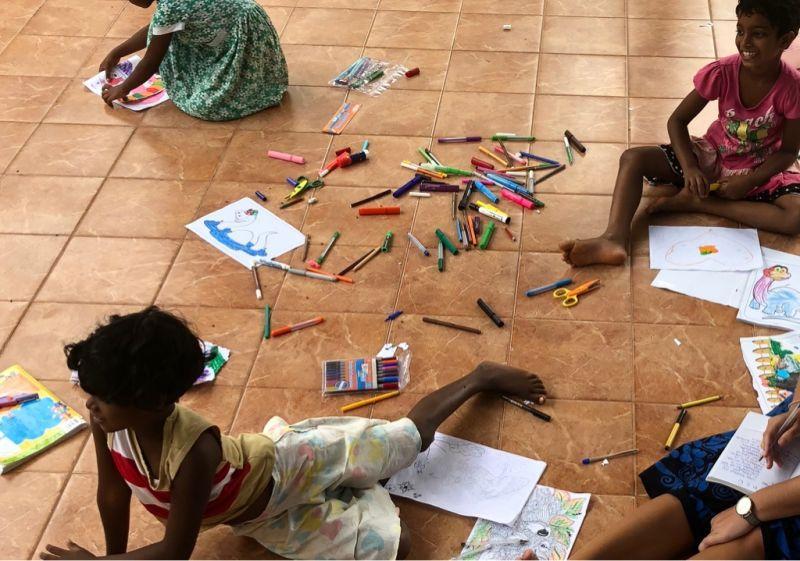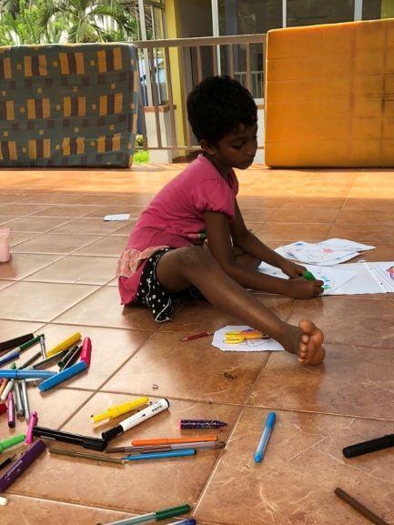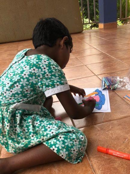 Weil es heute in der Playtime die ganze Zeit geregnet hat, haben wir mit den Mädchen Mandalablöcke und Stifte ausgepackt. Unter dem Dach von der "Stage" haben wir uns dann mit den Kleinen hingesetzt und losgelegt. Besonders Gayani und Sandhali hatten großen Spaß und haben uns Praktikantinnen am Ende mit Bergen von fertigen Mandalas überhäuft. Zwischendurch reichen sie dir immer wieder neue Blätter, sorgen dafür, dass du alle Farben an Stiften um dich hast und sagen wie "Nice" dein Mandala aussieht. Jedes mal wenn eins fertig war, kamen sie aufgeregt zu dir und wollten, dass du deren Namen und deinen dazu schreibst. Wie kleine Engel haben sie sich jedes Mal ins Zeug gelegt und sich Mühe gegeben, das letzte Bild noch einmal zu übertreffen. Nur als es dann ums Aufräumen ging, verging bei allen schnell die Lust. Ein paar Aufforderungen reichten jedoch aus und so war alles schnell erledigt. Die Kleinen können zwar richtige Engel sein, trotzdem bleiben sie aber auch einfach Kinder.