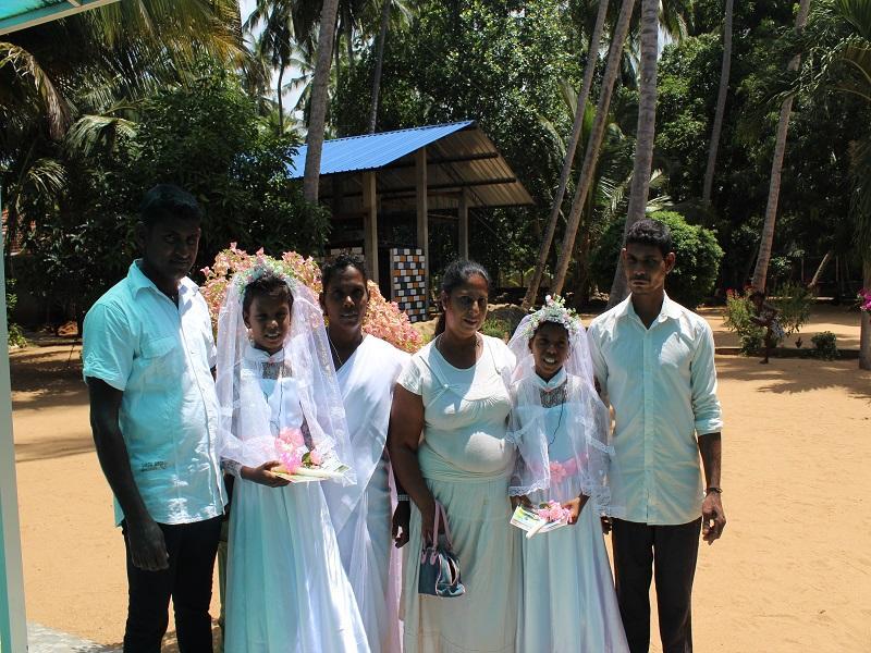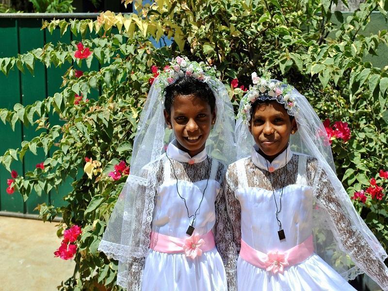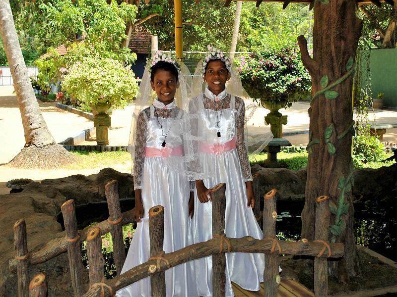 Am letzten Sonntag gingen Dewmini und Nethmi einen besonderen Schritt in Richtung des Erwachsenwerdens in Form der heiligen Erstkommunion. Zu diesem besonderen Ereignis kamen auch ihre Familienangehörige, die alle sehr schick in Weiβ gekleidet waren. Die Mädchen trugen traditionelle katholische Gewänder und Blumenkränze samt Schleier.