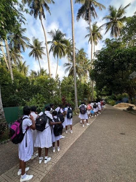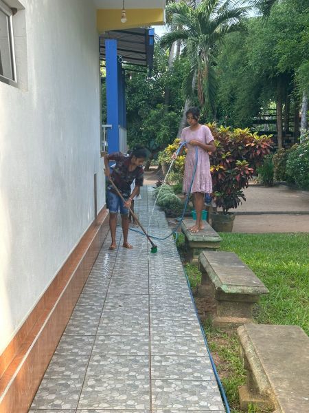 Am nächsten Morgen wurde tatsächlich pünktlich um 6:30 Uhr die Glocke geläutet. Die „Mitarbeiterinnen" weckten die anderen Mädchen ruhig auf. Es dauerte etwa 15 Minuten, bis alle draußen waren – wie sonst auch. Nachdem sie den bereitgestellten Tee getrunken hatten, ging es direkt ans Fegen. Der Garten war, glaube ich, noch nie so schnell sauber. In der Küche bereitete Gruppe 4 (die Küchengruppe der Woche) mit Raini, Sachini und Achini das Frühstück zu: Reis und Sambol. Nach dem Abwasch wurde um 8 Uhr pünktlich das Frühstück serviert. Ich nutzte die Gelegenheit und fragte in die Runde, wer sich freut, dass sie nun allein sind. Na, was denkt ihr? Wie viele haben sich gemeldet? Richtig: alle 56 Mädchen. Es war übrigens das ruhigste Frühstück, das ich je miterlebt habe.