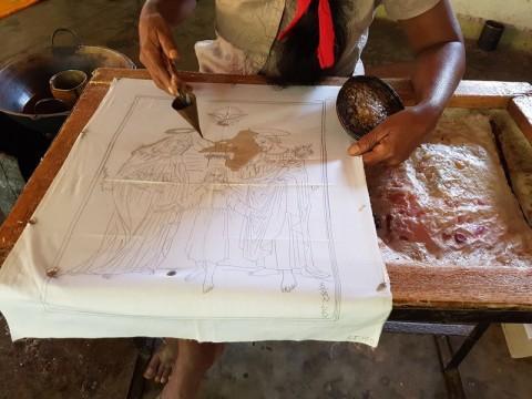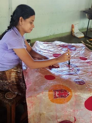 Während des Einkaufens mit Marie und Chiara ging es spontan in einen Batik-Shop hier in Marawila. Im hinteren Teil des Gebäudes werden die Muster auf die Stoffe gezeichnet, mit Wachs die Stellen getränkt, die keine Farbe aufnehmen sollen und anschließend eingefärbt. Auch die Nähwerkstatt war direkt neben an und wir hatten das Glück uns alles einmal anschauen zu dürfen. Ganz schön aufwendige feine Arbeit! Am Ende trocknen die schön bunten Stoffe im Innenhof – übrigens kommen auch unsere Uniformen von hier 😉