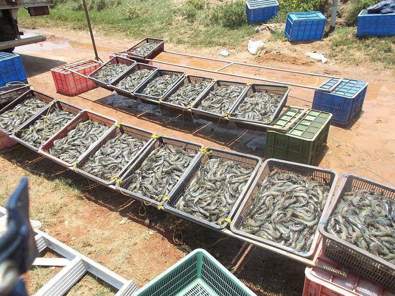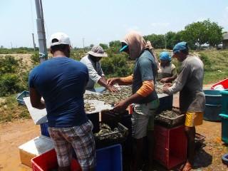 So konnte ich den Männern zusehen, wie sie die Garnelen mit einem großen Netz aus dem Wasser zogen und dann auf einem großen Tisch ausbreiteten, um die Qualität jedes einzelnen Exemplars zu prüfen. Insgesamt wurden an diesem Tag 2500kg Garnelen aus dem Becken gefischt, wovon jedes Kilo für 1200 bis 1500 Rupies (umgerechnet ca. 7,50€ - 9,40€) verkauft werden kann – ein stolzes Sümmchen, das da zusammenkommt!