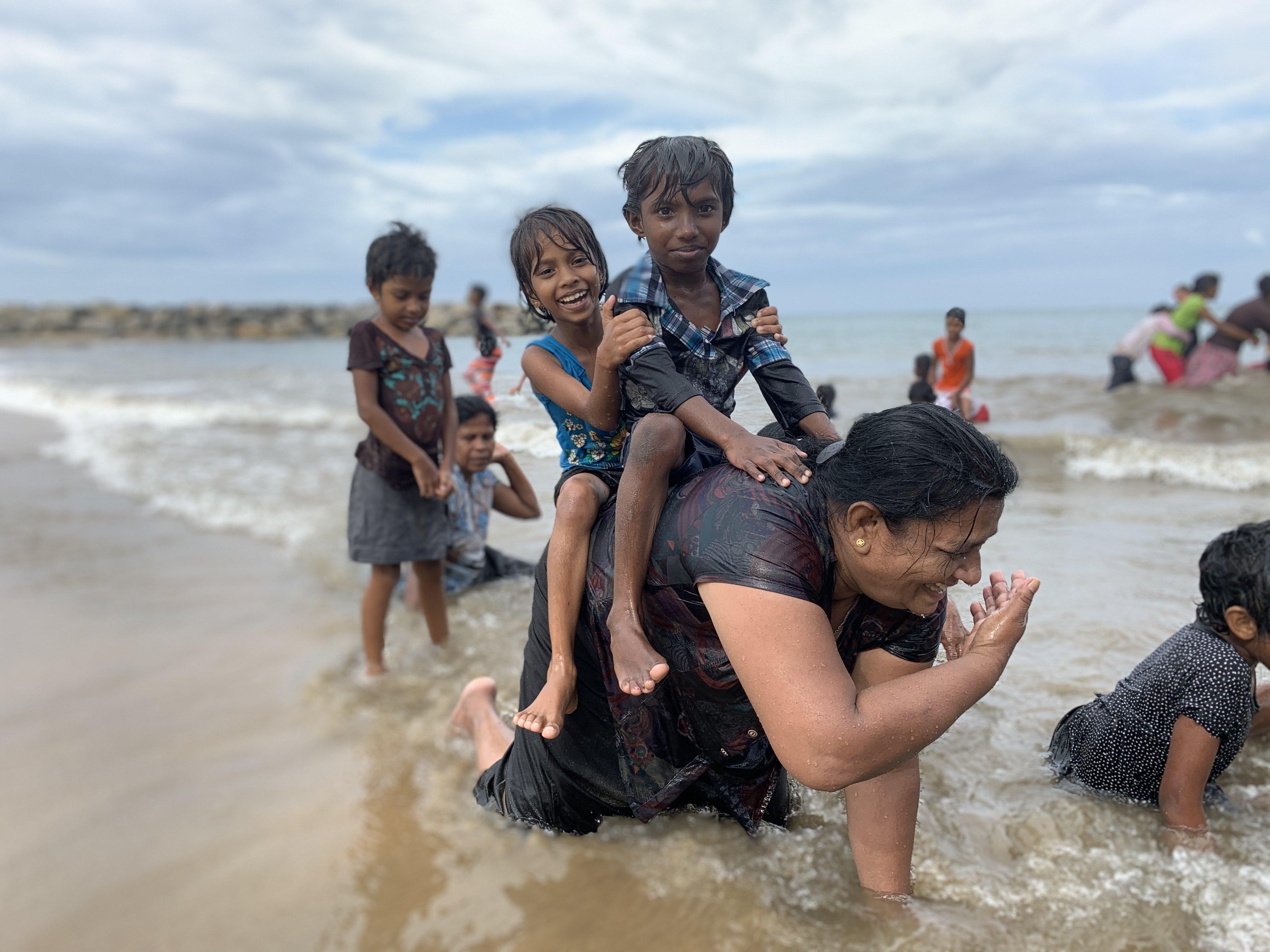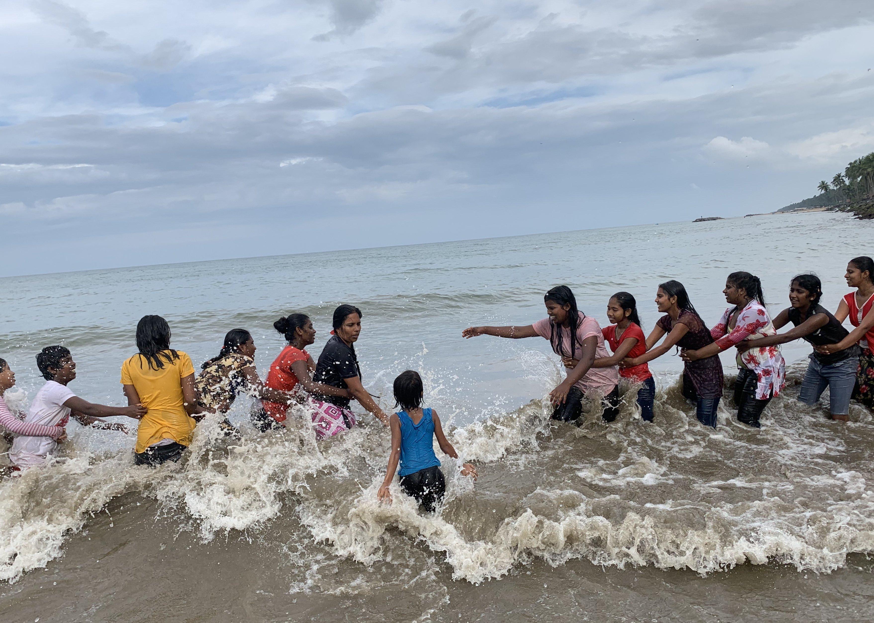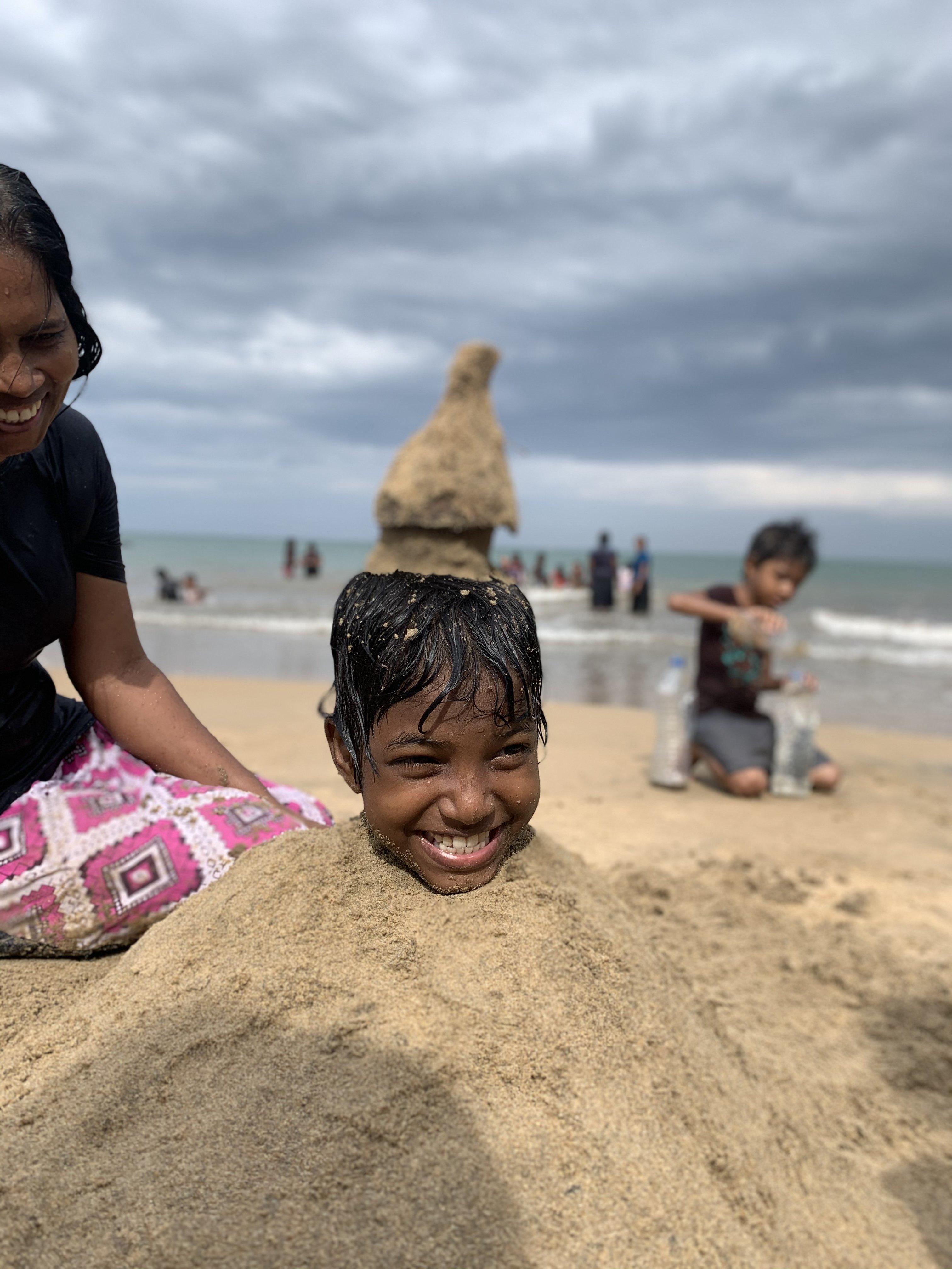 Diese Woche sind wir bereits am frühen Morgen mit den Mädchen, drei Erzieherinnen und Julia zum Marawila Beach spaziert. Auch wenn die Sonne nicht schien, hatten wir dennoch Glück mit dem Wetter – es hat nicht geregnet und das Meer war sehr ruhig, sodass die Mädchen in aller Ruhe im Wasser plantschen und sich treiben lassen konnten. Direkt bei der Ankunft am Strand sprangen nahezu alle Mädchen ins Wasser. Dabei musste ich gar nicht viel machen – selbstständig fielen ihnen verschiedene Spiele im Wasser ein und sie konnten sich (gefühlt) stundenlang damit beschäftigen, hätten wir nicht nach mehr als einer Stunde schließlich gesagt, dass es langsam Zeit wird, nach Hause zu gehen. Während dem Plantschen im seichten Wasser war es lustigerweise das größte Ziel einiger Mädchen, Julia oder mich ins Wasser zu tauchen. Dabei haben die Mädchen strategisch klug abgewartet, bis ich mein Handy bei Anusha, einer der Erzieherinnen, abgegeben habe. Nur wenige Momente später kamen einige Mädchen auf mich zu, um ihren Plan, mich ins Wasser zu tauchen, in die Tat umzusetzen. Obwohl ich mich lange Zeit gewehrt habe, gaben die Mädchen nicht auf und ich musste mich am Ende geschlagen geben, sodass ich mich kurze Zeit später unter der Wasseroberfläche wiedergefunden habe.