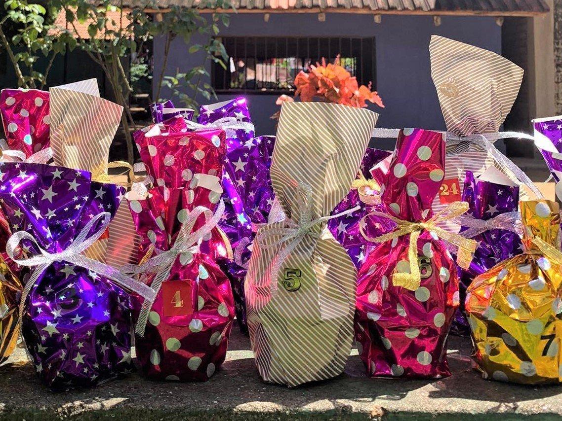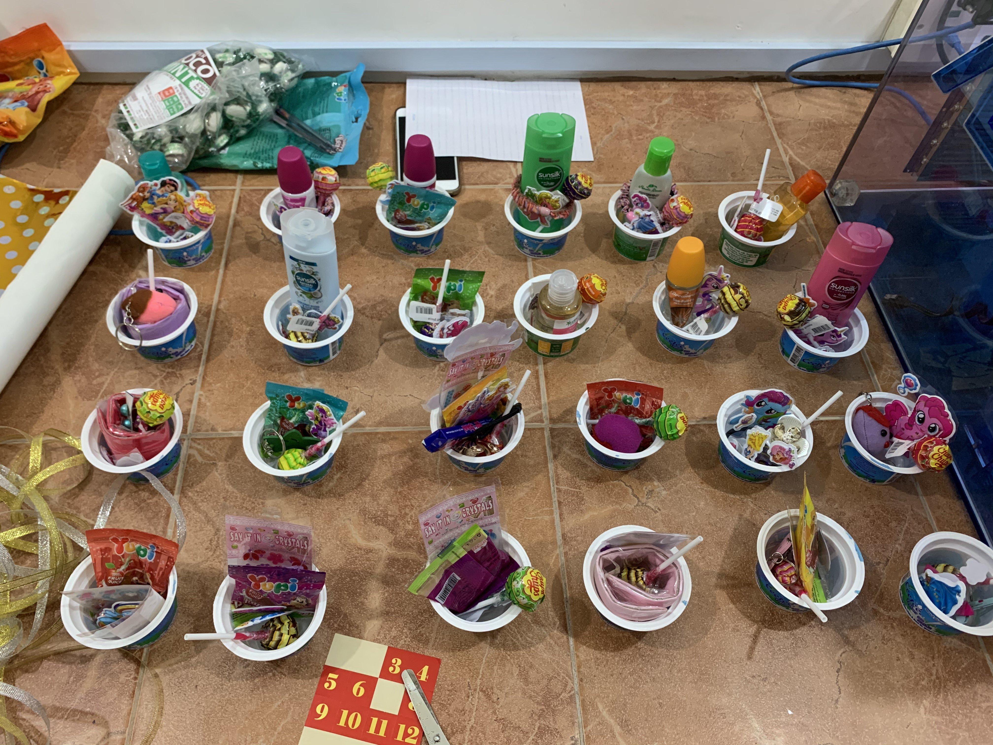 Wir haben uns dafür entschieden, einen Adventskalender mit kleinen Überraschungen in verschiedenen bunt-verpackten Päckchen zu basteln und jeden Tag vom 1. bis zum 24. Dezember den Namen eines Mädchens zu ziehen. Da die Mädchen in verschiedenen Altersgruppen sind, mussten wir berücksichtigen, dass für jedes Mädchen etwas dabei ist.