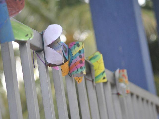 Damit nicht nur die Kinder, die aus den Ferien kamen, zeigen konnten, was sie gemacht hatten, hatten wir mit den verbliebenen Kindern des Projekts Schmetterlinge gebastelt und diese aufgehangen, sodass auch sie zeigen konnten was sie in den Ferien selbst gebastelt hatten. Stolz zeigten sie ihre selbstgemachten Schmetterlinge und die anderen Kinder sollten raten von wem welcher Schmetterling gebastelt wurde. Für mich heißt es jetzt die neuen Namen lernen, da ich viele Kinder in diesen Tagen das erste Mal sehe.