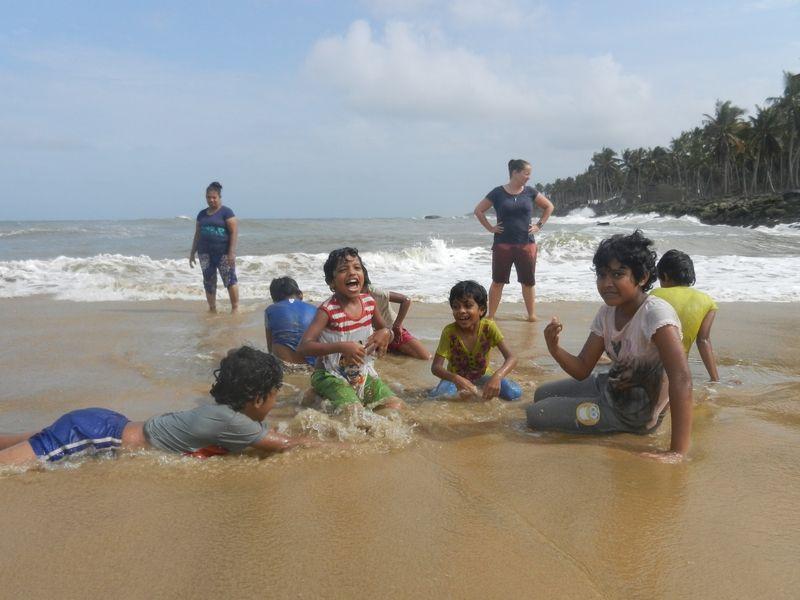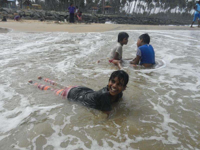 Heute haben wir den Vormittag des Ferientages am Strand verbracht. Die Mädchen haben sich so sehr darauf gefreut, dass sie bereits einige Tage zuvor immer wieder gefragt haben, wann es denn endlich an den Strand geht. Glücklicherweise hat es heute Vormittag nicht geregnet, sodass ihr Wunsch, im Meer zu baden, erfüllt werden konnte. Um 08:30 Uhr machten wir uns daher auf den Weg zum nahe gelegenen Strand. Dort angekommen, dauerte es keine 5 Sekunden bis die ersten Mädchen auch schon am Wasser planschten. Leider waren die Wellen an diesem Tag sehr hoch, sodass sie nicht tiefer ins Wasser konnten. Aber auch am Ufer hatten die Mädchen mit jeder ankommenden Welle ihren Spaß. Sie legten sich ans Ufer und lachten sich bei jeder Welle, die sie überspülte, schlapp. Zu Beginn beobachtete ich erstmal die ganzen lachenden Kinder und machte ein paar Fotos. Kaum hatte ich allerdings die Kamera weggelegt, ging es dank Piumi auch für mich auf Tauchstation. Klitschnass und völlig erschöpft kamen wir circa zwei Stunden später wieder im Angels Home an. Das war definitiv ein Vormittag, an dem alle ihren Spaß hatten!