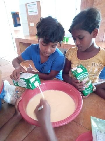 Fleißig wurde Mehl, Eier, Milch und Zucker vermischt und zu einer riesen Menge Teig verarbeitet. Immer wieder erstaunlich, wie viel die Rasselbande im Angels Home verspeisen kann. Natürlich wurde ab und zu vom Teig und der Schüssel geschleckt. Wer in der Küche steht muss natürlich auch belohnt werden!