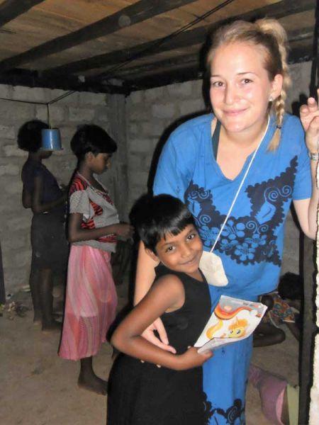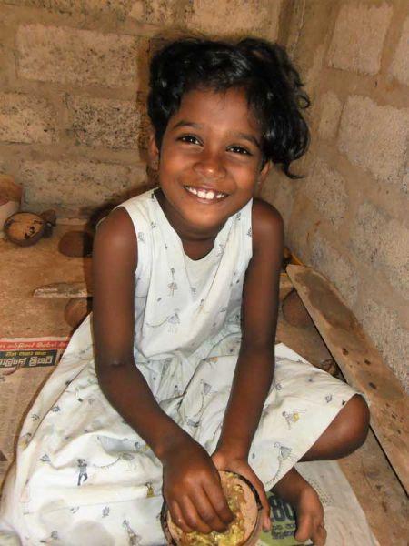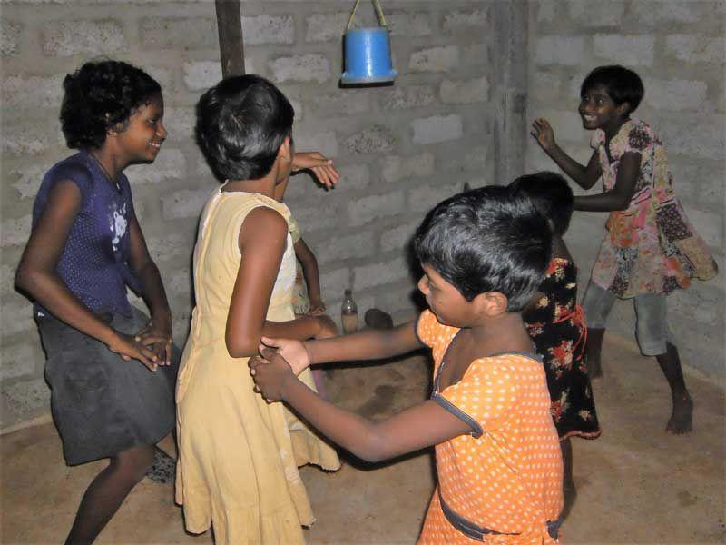 Verschmitzt streckt Vishmi ihren Kopf aus dem Eingang des steinernen, bunten Raums auf dem Spielgelände hervor. Die vier Mauern, die den Platz zu einer Art „Rückzieh-Ecke" formen, sind in den Farben blau, grün, weiß und gelb gestrichen. Diese „Nische" befindet sich direkt auf dem überdachten Spielplatz. „Hey Vishmi, may I come in?" (darf ich eintreten?) frage ich sie und bekomme als Antwort ein strahlendes Gesicht und eine entgegengestreckte Hand. Als ich eintrete, erinnern mich die Szenen, die sich drinnen abspielen, an das direkt gegenüber befindliche Gebäude: den Innenbereich unseres Angels Homes. 😊 Dies wird mir dann von den Mädchen bestätigt. Es soll das Angels-Home darstellen.