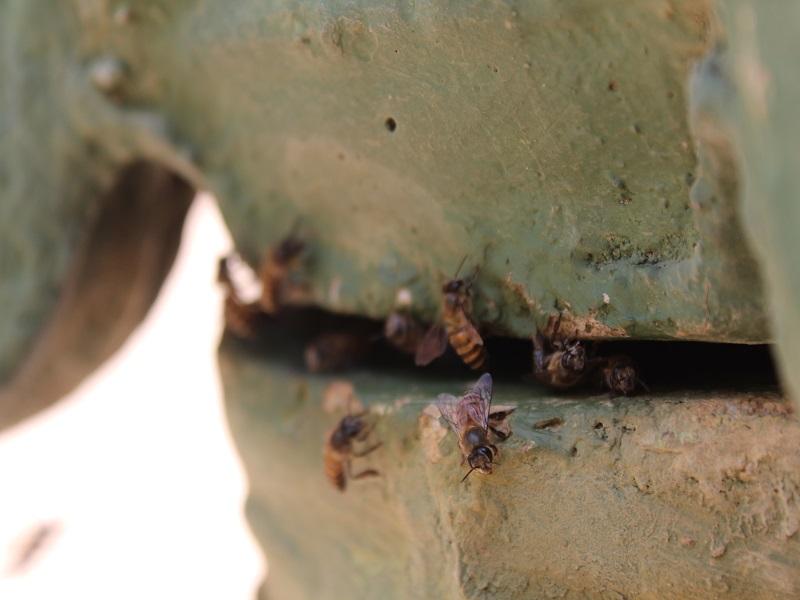 Und tartsächlich, in einem Spalt am Boden des Blumentopfes herrscht ein munteres treiben. Etwa 20 Bienen hängen und krabbeln dort rein und raus.