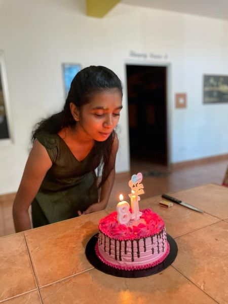Als der Vater um ca. 14 Uhr ankommt, kommt er nicht mit leeren Händen. Für alle Mädchen und auch für die Mitarbeiter und uns, hatte er Kuchen und Banane mitgenommen. Darüber haben sich alle sehr gefreut. Als wir traditionell um 16 Uhr zur Teezeit anfangen Vishmini ihr Geburtstagslied zu singen, sehen wir, wie der Vater aus der Distanz zuschaut. Kurzerhand entscheiden wir, ihn herzuholen, damit er diesen schönen Moment direkt neben seiner zweiten, kleineren Tochter, Vidukshini teilen konnte. Liebevoll nimmt er sie dafür seitlich in den Arm und streichelt diesen ruhig auf und ab. Ohne weiter aufzufallen, beobachtet er die Szene. Alle 60 Mädchen sind aufgestanden und singen seiner jetzt volljährigen Tochter ein Geburtstagslied. Dabei blicken ihn wahrscheinlich viele freundlich lächelnde Gesichter an. Er aber lässt den Blick nicht von seiner Vishmini, im Augenwinkel sammeln sich die ersten Tränen. Stolz lächelt er seine Tochter an. Als wir fertig gesungen haben fängt Vishmini an ihre Torte zu schneiden. In Sri Lanka ist es Tradition ein Stück Kuchen abzuschneiden und anschließend von einer Person zur nächsten zu gehen, um diese abbeißen zu lassen. Vishmini reicht ihrem Vater das erste Stück, dieser schiebt das Stück Kuchen ganz gerührt von sich weg und Richtung Vishminis Mund. Auffordernd, dass sie die erste sein soll, die zu diesem besonderen Anlass vom Kuchen abbeißt. Nachdem sie dies macht, nimmt er sie kurz in den Arm. Seine Augen sind nun mit immer mehr Tränen gefühlt, kurzerhand entschuldigt er sich und läuft Richtung Eingang. Beim Gehen nimmt er seine Brille ab und wischt sich über seine Augen. Was wohl in ihm vorgeht? Zu sehen, in was für einer schönen Gemeinschaft Vishmini aufgewachsen ist, und seit 2019 ihr Zuhause nennt, was für eine Liebe sie von den ganzen Mädchen bekommt und wie gut hier um sie gesorgt ist, berührt ihn ganz bestimmt tief. Auch wahrscheinlich der Gedanke daran, dass er ihr das nicht bieten konnte, obwohl er das ganz klar versucht hat. Der klassische Familienvater konnte er notgedrungen nicht sein, wissentlich, dass er so viele Momente aus Vishminis und Vidus Kindheit dadurch verpasste.