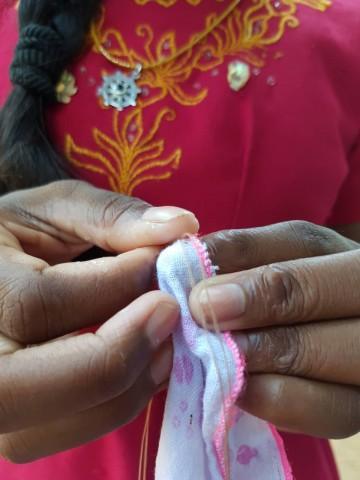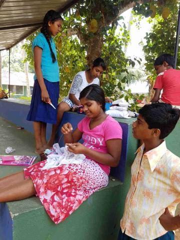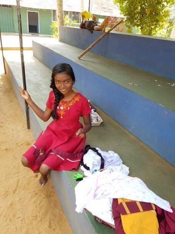 Bei 50 Mädchen Kleidung von der Wäscheleine Zuzuordnen ist gar nicht so einfach. Da sich die bisherigen Edding-Punkte oft auswaschen, hat unsere unsere Managerin Dinesha dem Kleider-Chaos den Kampf angesagt. Es werden die Gruppen und Nummern der Mädchen, in den Gruppenfarben in alle Sachen gestickt. Bei 50 Mädchen ist das eine Menge Arbeit und so helfen die Erzieherinnen und großen Mädchen fleißig mit. Bei uns wird also momentan die Nadel geschwungen ;) zum Glück nicht bis die Finger bluten, sondern nur bis alle Uniformen eine Nummer und alle Socken einen Punkt haben ;)