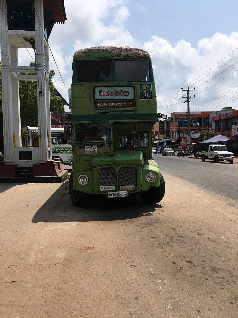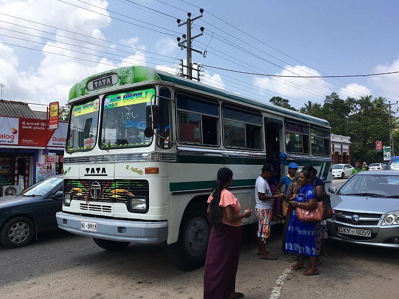 Denn schon als wir an der Bushaltestelle warteten, rumpelte da ein grün verzierter Hippie Bus wie aus den 60er Jahren auf uns zu und beim Einsteigen dudelte uns dann singhalesische Reggeamusik aus den Lautsprechern durch die offenen Fenster entgegen. Der Bus war schon gut besetzt und wurde durch uns nun so voll, dass der Fahrkartenverkäufer sich im Zwischengang an uns vorbei quetschen musste. Dicht gedrängt, den Fahrtwind im Gesicht und mit beiden Händen an der Haltestelle ruckelten wir so ins nächste Dörfchen.