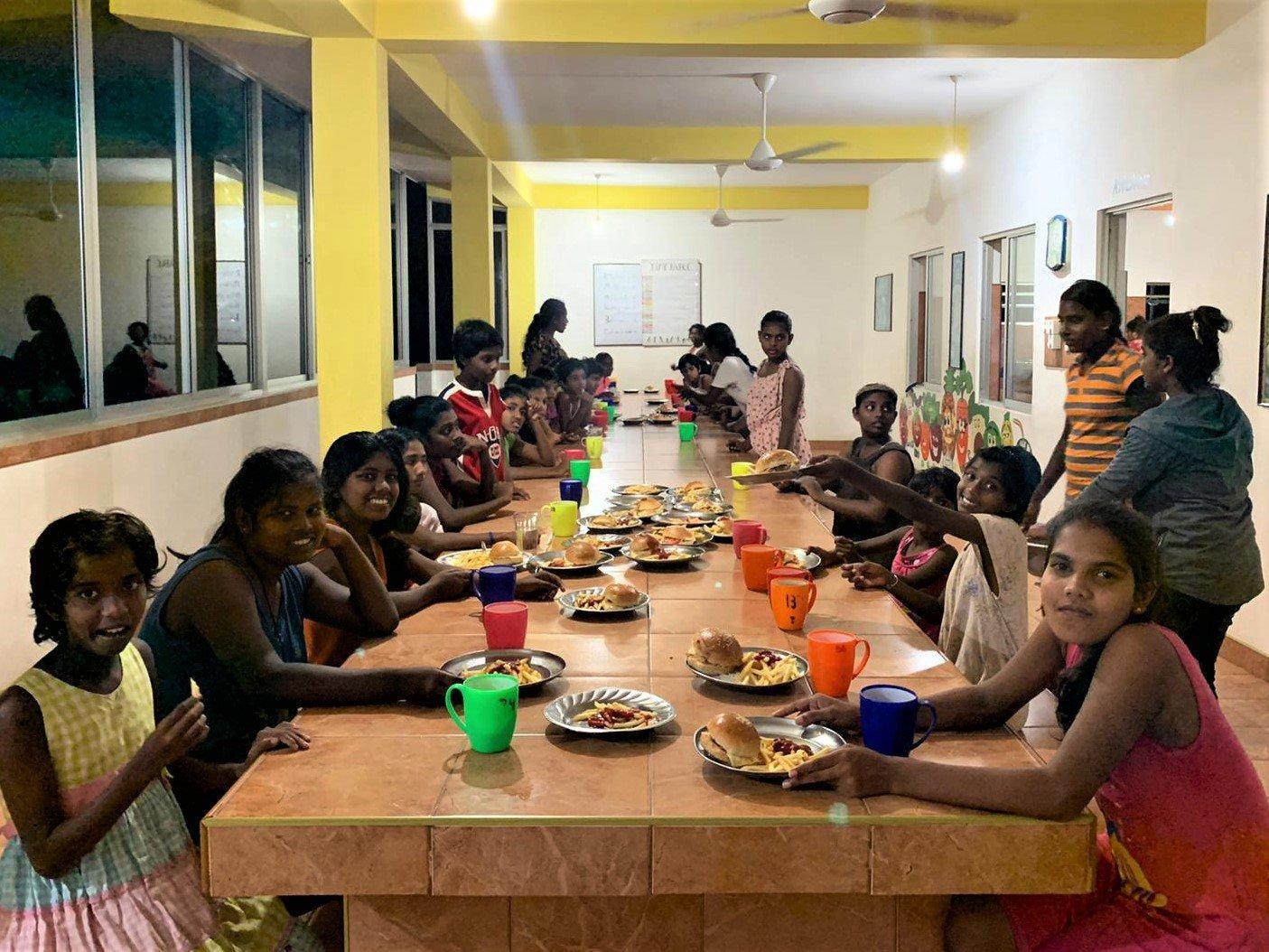 Am Wochenende gab es für alle Mädchen, die ihre Weihnachtsferien bei uns im Angels Home verbringen, eine Runde Chicken-Burger und Pommes Frites. Frank hat sich wieder mal eine Gruppe Mädels in die Trainingsküche geholt, die dort unter seiner Anleitung ein leckeres Abendessen für alle zubereiten durfte. Diesmal waren Ranisha, Salani, Shashikala und Bahgya seine Helferlein und innerhalb von 3 Stunden waren 70 Burger mit Hühnchenfleisch, Tomaten, Zwiebeln, einer leckeren Yoghurtsauce und Käse zubereitet. Außerdem gab es insgesamt 5 kg Pommes Frites. Das Ergebnis war wirklich super lecker und wir alle haben es uns richtig gut schmecken lassen. Danke, Frank! Und danke, liebe Mädels!