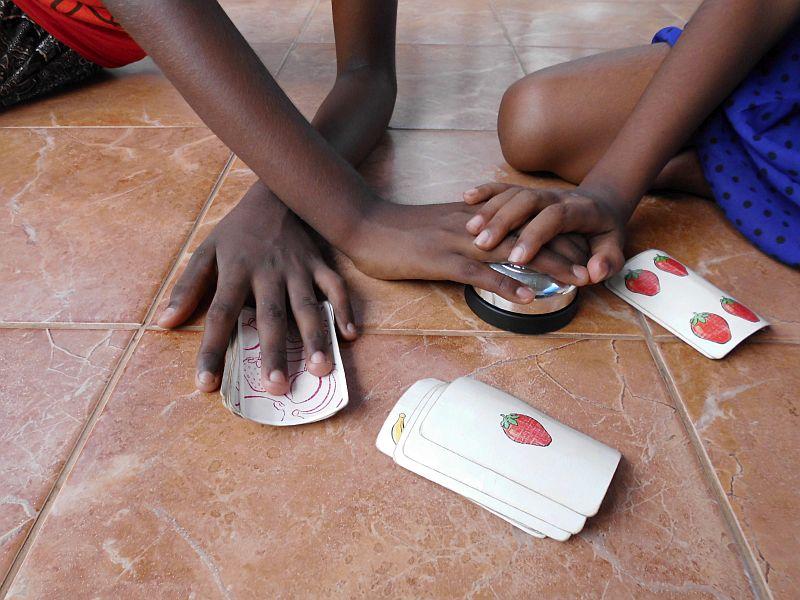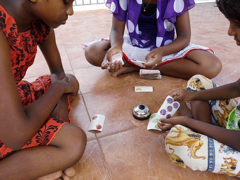 Pünktlich zur Spielzeit fällt täglich der Name des begehrtesten Spieles: Halli Galli. Ziel des Kartenspiels ist es fünf Früchte einer Sorte aufzudecken und dabei möglichst als schnellster Spieler die Klingel zu läuten. Dieser Spieler bekommt dann die Ablagestapel. Wer am Ende die meisten Karten hat gewinnt. Unserem Halli Galli sieht man zwar schon an, dass es ein "Dauerbrenner" ist, dies tut dem Spaß an dem Spiel aber keinen Abbruch. So sehe ich mich nun also in den nächsten Wochen fleißig tagtäglich mit den Mädchen die Klingel läuten!