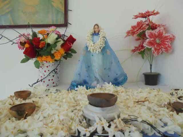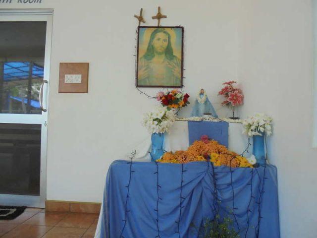 Als Vorbereitung für diese kleine Prozession wurde der Weg vom Tor bis zum Eingang des Hauses mit Girlanden gesäumt. Auch der kleine Altar im Erdgeschoss des Angels Home wurde festlich mit Blumen, Kerzen und Lichterketten geschmückt.