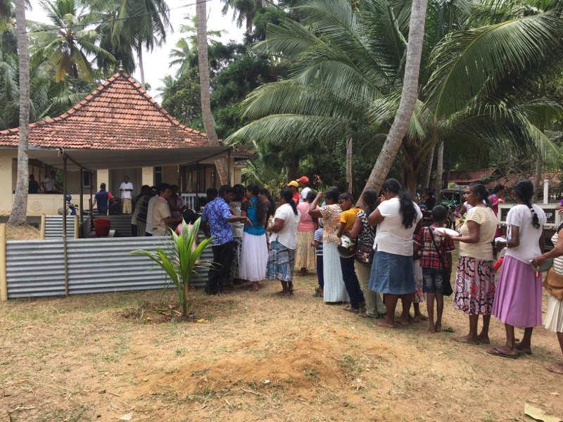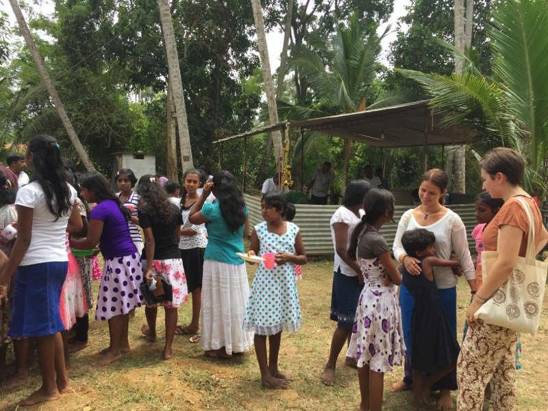 Gerade an Festtagen werden auf der Tempelanlage kleinere Stände aufgebaut, an denen sich die Besucher zur freien Essensausgabe anstellen können.Vor einem der kleinen Stände hatte sich dann auch bereits eine lange Warteschlange von Menschen gebildet, an die wir uns gleich darangehängt haben und, mehr oder weniger, geduldig auf die Essensausgabe gewartet haben. Dilmi neben mir hatte schon ziemlich Hunger und hat sich mit kleinen kreisenden Bewegungen den Bauch gerieben, um ihrer Ungeduld einen Nachdruck zu verleihen. Sie war dann auch besonders glücklich, als eine der Hausmütter etwas von ihrem süßen, klebrigen und würzig duftendem Milchreis mit den Mädchen geteilt hat und diese darüber lachen mussten, dass sie Schwierigkeiten hatte, ihn in der Hand zu halten. Der frisch zubereitete und heiße Milchreis wurde nämlich nur durch ein Palmenblatt von ihrer Handfläche getrennt.