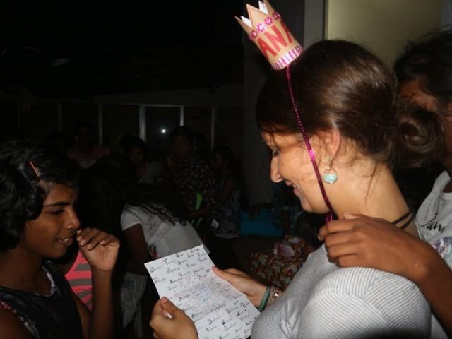 Es war ein wirklich rundum perfekter Tag. Am 11. März durfte ich meinen 28. Geburtstag im Angels Home feiern. Ich wusste nicht was mich erwartete, doch dieser Geburtstag hat alles übertroffen. Am Samstag feierten wir eine große Party mit allen Kindern, mit leckerem Essen, DJ, viel Tanz und guter Stimmung. Alle Kinder von groß bis klein waren dabei! Pabodani und ich hatte beide am darauffolgenden Tag Geburtstag. Sie ist genau 10 Jahre nach mir geboren und wurde somit 18 Jahre alt. Um 24 Uhr wurde unser Tanz unterbrochen, der DJ spielte Happy Birthday und alle Kinder und Praktikantinnen kamen zu uns gerannt um uns zu beglückwünschen. Es gab eine Torte und alle sangen und freuten sich mit uns. Die Kinder hatten eine unglaublich süße Karte für mich gebastelt und ich wurde mit einer kleinen Geburtstagskrone ausgestattet. Ein wirklich gelungener Start in das neue Lebensjahr!! Noch bis 1 Uhr feierten und tanzten wir im Sand, bis wir todmüde ins Bett fielen.