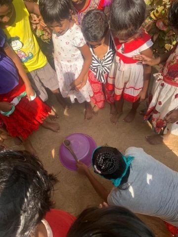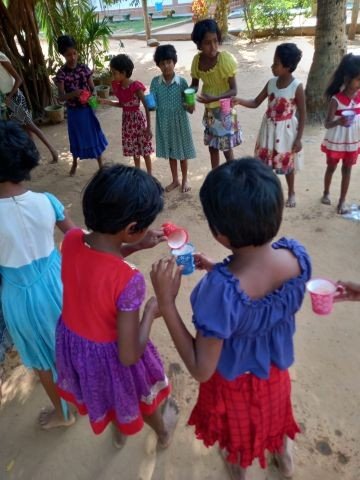 Nach dem Mittagessen haben wir gemeinsam mit den Mädels einen Spielenachmittag veranstaltet. Auf dem Programm stand das Spiel „Wassertragen", in welchem 2 Mannschaften versuchen, so schnell wie möglich, dass Wasser von einem Eimer in den anderen zu befördern, indem sie das Wasser von Becher zu Becher tragen. Die Mädels hatten sichtlich Spaß und kaum einer ist trocken geblieben. Anschließend wurde dann noch Topfschlagen gespielt. Jeder der Mädchen durfte sich einmal die Augen verbinden und mit dem Kochlöffel nach dem Topf suchen. Es war schön zu sehen, wie sich alle gegenseitig geholfen haben, den Topf mit den Süßigkeiten zu finden. So hatte am Ende jeder etwas zu naschen.