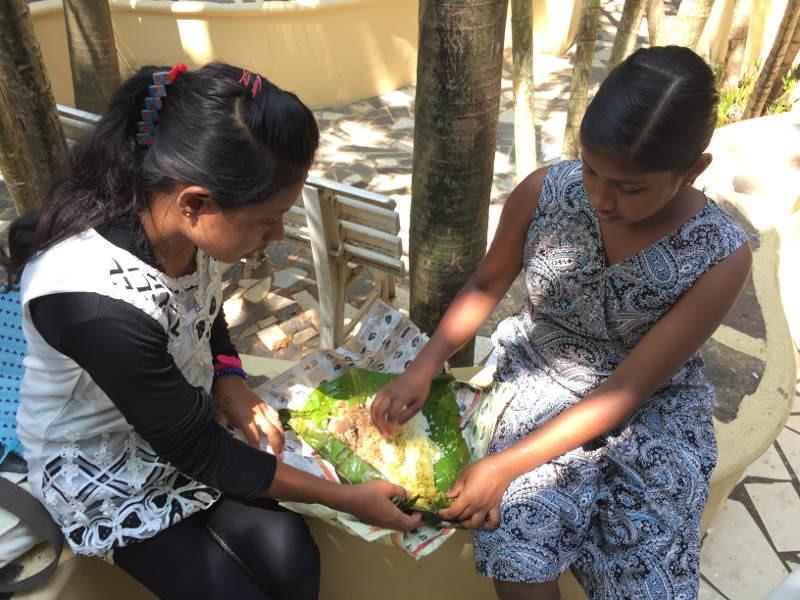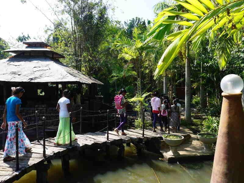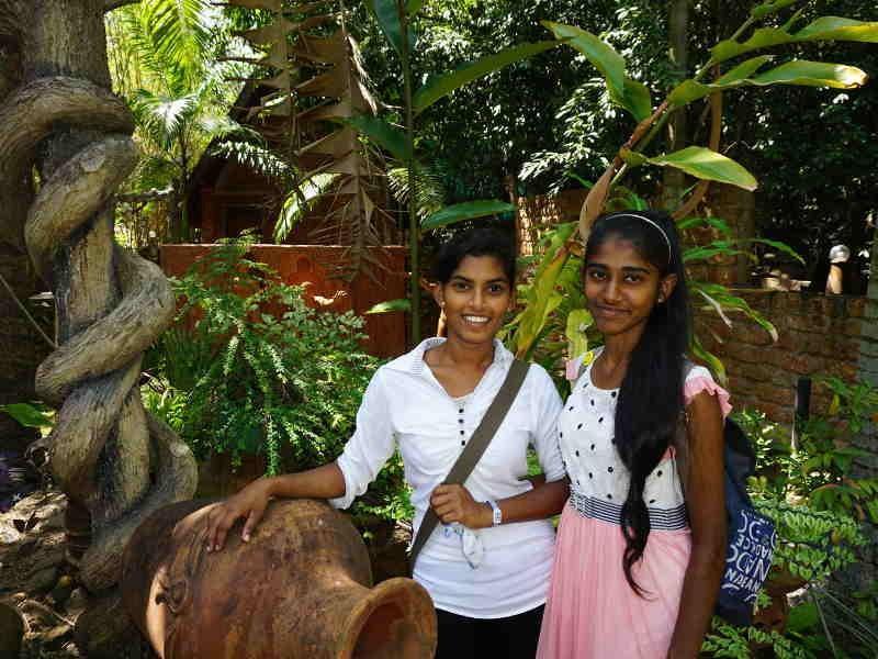 Dulari und ich begleiteten die 22 Mädchen und bereits am Vorabend bereiteten Sie die Lunchpakete (Reis, Curry und Ei) gut verpackt in Bananenblättern vor. Am Samstagmorgen um 07:30 Uhr ging es endlich los! Mit dem Bus ging es von Marawila nach Negombo und von dort mit einem zweiten Bus nach Seeduwa. Zuerst war ich etwas skeptisch als die Mädchen mir erzählten, dass sie eine Kirche besichtigen wollten. Doch als wir beim Supuwath Arana ankamen, erkannte ich schnell, dass es sich hier ganz und gar nicht um eine gewöhnliche Kirche handelte. Das große Areal ist wie ein Labyrinth aus Brücken, kleinen Gebetsstätten, Statuen, Felsen und Skulpturen aufgebaut. Folgt man den kleinen Wegweisern führen Sie einen durch die Lebens- und Leidensgeschichte von Jesus. Es gibt eine schwimmende Kirche in Form eines Bootes und eine Wand, an der jeder seine Gebete und Wünsche auf kleine Zettel schreiben kann. Gemeinsam staunten und wanderten wir fast drei Stunden lang durch den paradiesischen Garten. Viele der Mädchen sind katholisch erzogen und blieben an den Kreuzen und heiligen Stätten stehen um zu beten. Trotz der Hitze fühlten wir uns unter den Palmen und kleinen Gängen sehr wohl und geschützt. Den Mädchen schien es sehr zu gefallen und als wir unseren Rundgang beendet hatten plauderten sie noch viel über die erlebten und entdeckten Dinge.