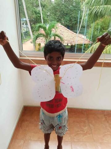 Viele der Mädchen basteln gerne und diesmal sind aus Papier, Toilettenpapierrollen, Pfeifenputzer und Wolle Schmetterlinge geworden. Zwei fliegen jetzt vorläufig in unserem Treppenhaus – sehr zum Stolz von Nethmi und Achnini 😊 Für jeden der nachbasteln möchte hier die Anleitung: