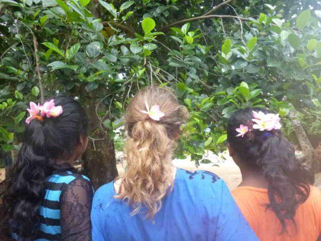 Heute fiel die Wahl auf eine Blüte, die nicht nur schön aussieht, sondern auch besonders gut duftet. Sandunika und Nipuni brachten auch mir eine Blüte, um sie mir gekonnt in den Haaren zu befestigen. Um diesen Moment festzuhalten, wollte ich ein Foto davon schießen. So eine Fotokamera lenkt natürlich viel Aufmerksamkeit auf sich.