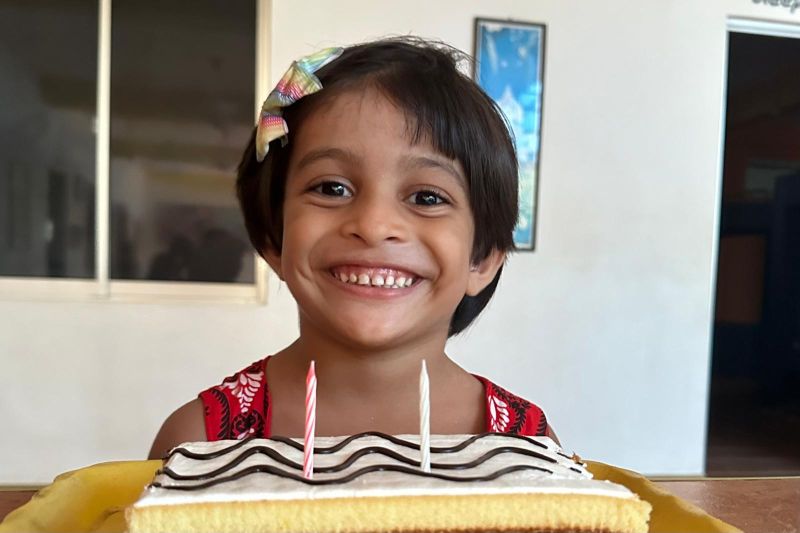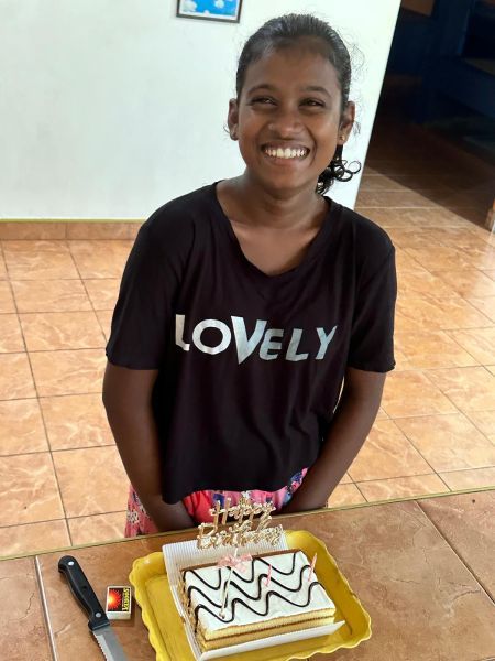 Zur Teezeit stand dann ein Fertigkuchen mit drei Kerzen am Kopfende bereit, und alle versammelten sich um den Tisch. Mein erster Gedanke beim Anblick des Kuchens war: „Der reicht doch niemals für 56 Kinder." Natürlich hatten die Kinder zusätzlich ihr Teegebäck vor sich liegen, aber wer freut sich nicht auf ein zusätzliches Stück Geburtstagskuchen? Ich war gespannt. Das Geburtstagskind saß am Kopfende vor ihrem Kuchen. Auf drei sangen dann alle 55 Angels und das Personal die englische „Happy Birthday to you"-Version, ergänzt durch die singhalesische Version. Für mich war das jedes Mal ein wunderbarer Moment – wenn so viele Menschen zusammen singen, klingt es einfach schön. Danach schnitt das Geburtstagskind ein Drittel des Kuchens in sechs Stücke. Das erste Stück wurde genommen und zum ersten Kind gebracht. Dieses biss ein kleines Stück ab, dann ging das Geburtstagskind mit dem angebissenen Stück weiter zum nächsten Kind, das ebenfalls ein Stück abbiss. So ging es weiter, bis das Kuchenstück vollständig aufgeteilt war. Danach schnappte sich das Geburtstagskind das nächste Stück Kuchen. Jeder durfte einmal vom Kuchen probieren und abbeißen. Der restliche Kuchen gehörte dem Geburtstagskind – ein Stück wurde sofort gegessen, der Rest in einer Tupperbox für später verstaut.