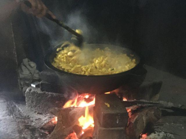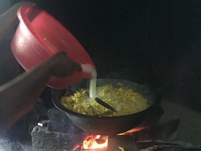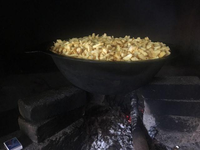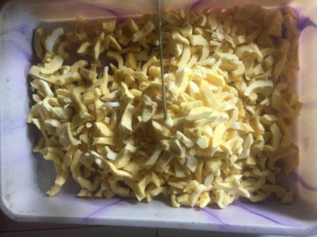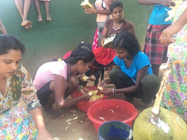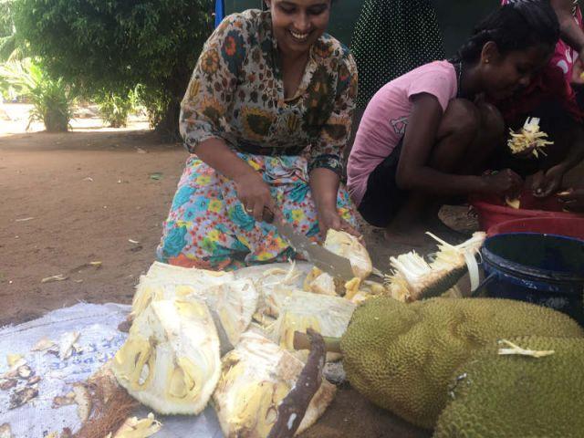 Heute morgen wurden die Jackfruits frisch von den Mädchen geerntet und vorbereitet. Eine schweißtreibende Arbeit, da man die Früchte erst mit dem Messer zerkleinern muss und danach das Fruchtfleisch herauspulen muss. Der weiße, klebrige Saft der Frucht ist dabei keine Hilfe. Nachdem das hellgelbe Fleisch gesäubert wurde, wird es anschließend in dünne, pommesähnliche Stücke geschnitten.