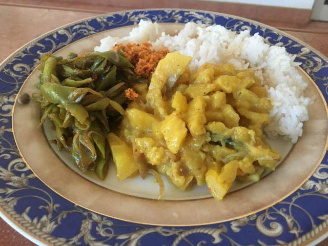 Nun kann je nach erneut nachgewürzt werden. Wer nicht gerne scharf isst, sollte von Anfang an weniger Chilipulver benutzen, da die Gerichte in Sri Lanka sehr würzig sind. Serviert wird das Curry am Besten mit Reis.