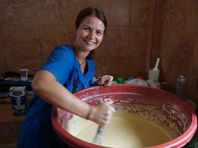 Für die Überraschungsparty soll es zum Nachtisch Kaiserschmarrn geben, so lautet der Plan. So starteten Valentina um 4 Uhr nachmittags mit dem Eiertrennen, denn bei 150 Eiern dauert das schon ein bisschen. Valentina fing dann an nach meinen Anweisungen die Masse mit den Eidottern, dem Mehl, der Milch und dem Zucker fertig zu stellen, während ich das Eiweiß zu Schnee geschlagen habe. Mit dem Schneebesen bei so einer großen Menge gar nicht so ohne. Nach einer guten Stunde waren wir mit allem fertig und waren über das Endergebnis total erstaunt. Eine extrem große Schüssel mit Kaiserschmarrnmasse hatten wir vor uns, die wir in zwei kleinere umfüllen mussten damit diese in das Kühlhaus passten.