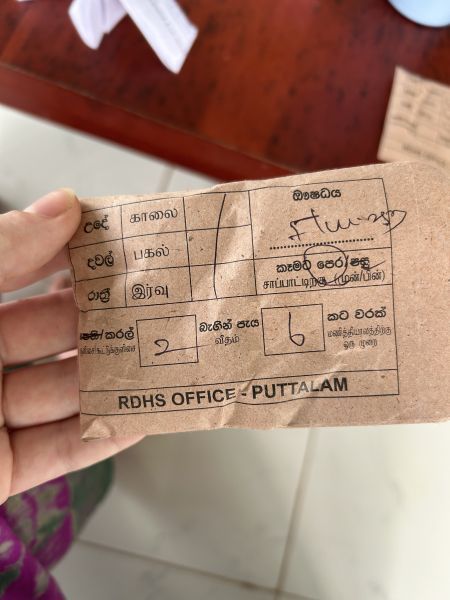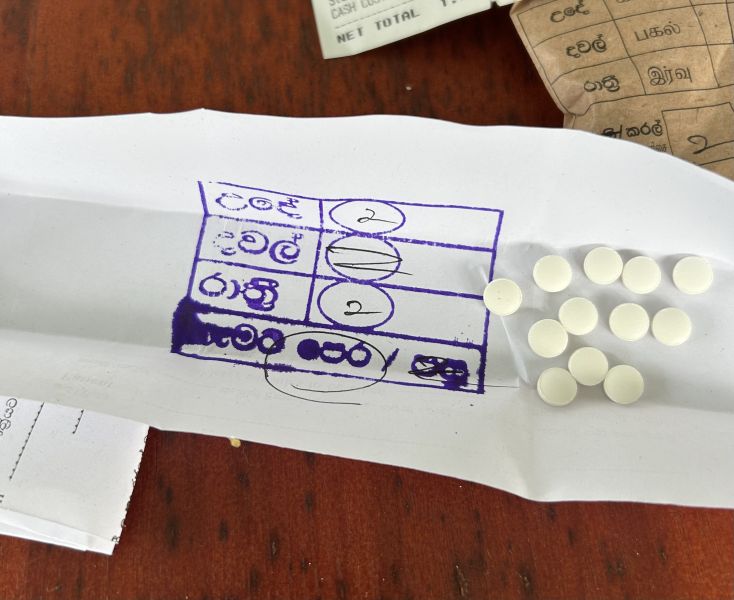 Ein separates Behandlungszimmer gab es nicht: Stattdessen saßen fünf Ärzte in einem Raum, jeder an seinem Schreibtisch. Sie riefen die Patienten nacheinander auf, schauten kurz auf die Beschwerden und verschrieben dann Medikamente. Nach einem kurzen Blick auf den Fuß wusste die Ärztin sofort was zu tun war und schrieb mir, ohne viel zu erklären, eine lange Liste mit Medikamenten auf: 5 verschiedene Tabletten und2 Cremen. Das hat erstmal alarmierend gewirkt, aber anscheinend sind so viel Medikamente in Sri Lanka normal. Die Tabletten habe ich dann in kleinen Papiertüten, einzeln abgezählt an einem Schalter bekommen. Teilweise wusste ich nichtmal den Namen von den Tabletten.
