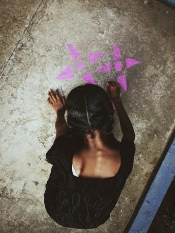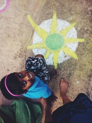 Von 17:00-18:00 Uhr ist im Angels Home immer Spielzeit. Damit unsere Mädels nicht zum 100ten mal Elle oder mit den Barbies spielen haben wir ihnen dieses mal ein paar Kreiden in die hand gedrückt. Was dabei herausgekommen ist könnt ihr auf dem Foto hier sehen. Ich kann euch jedoch sagen das nicht nur die Einfahrt in einem Meer voller Bunter Blumen und Mandalas verzaubert wurde, sondern ebenfalls die Gesichter der Künstler sowie Unschuldiger Zuschauer.