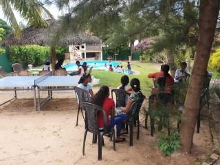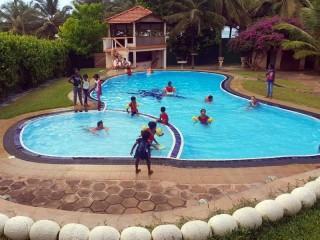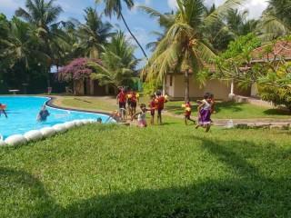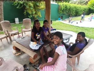 Gestern, also am 25.12., war dann hier der eigentliche Weihnachtsfeiertag, wo auch viele der Einheimischen tatsächlich mal alle Viere gerade sein lassen oder Zeit mit der Familie verbringen. Bei uns im Angels Home ist an diesem Tag meist kaum Personal da, weil sie natürlich auch alle frei haben wollen. Somit wollen wir auch nicht, dass an Weihnachten im Heim jemand kochen oder saubermachen muss und deshalb gehen wir an diesem Tag meistens irgendwohin zum Essen. Dieses Mal fiel unsere Wahl auf Bridden´s Place - ein kleines Guesthouse ganz in unserer Nähe, welches von lieben Freunden betrieben wird und ein super Essen macht. Da Harry und Chamali über Weihnachten keine Gäste hatten, fragten wir schon vor einiger Zeit bei ihnen an, ob wir unser diesjähriges Weihnachtsessen mit den Mädels bei ihnen verbringen dürfen. Schnell stimmten die Beiden zu und somit hatten wir eine super Location für die Girls, die natürlich auch gruppenweise den super Pool benutzen durften.