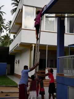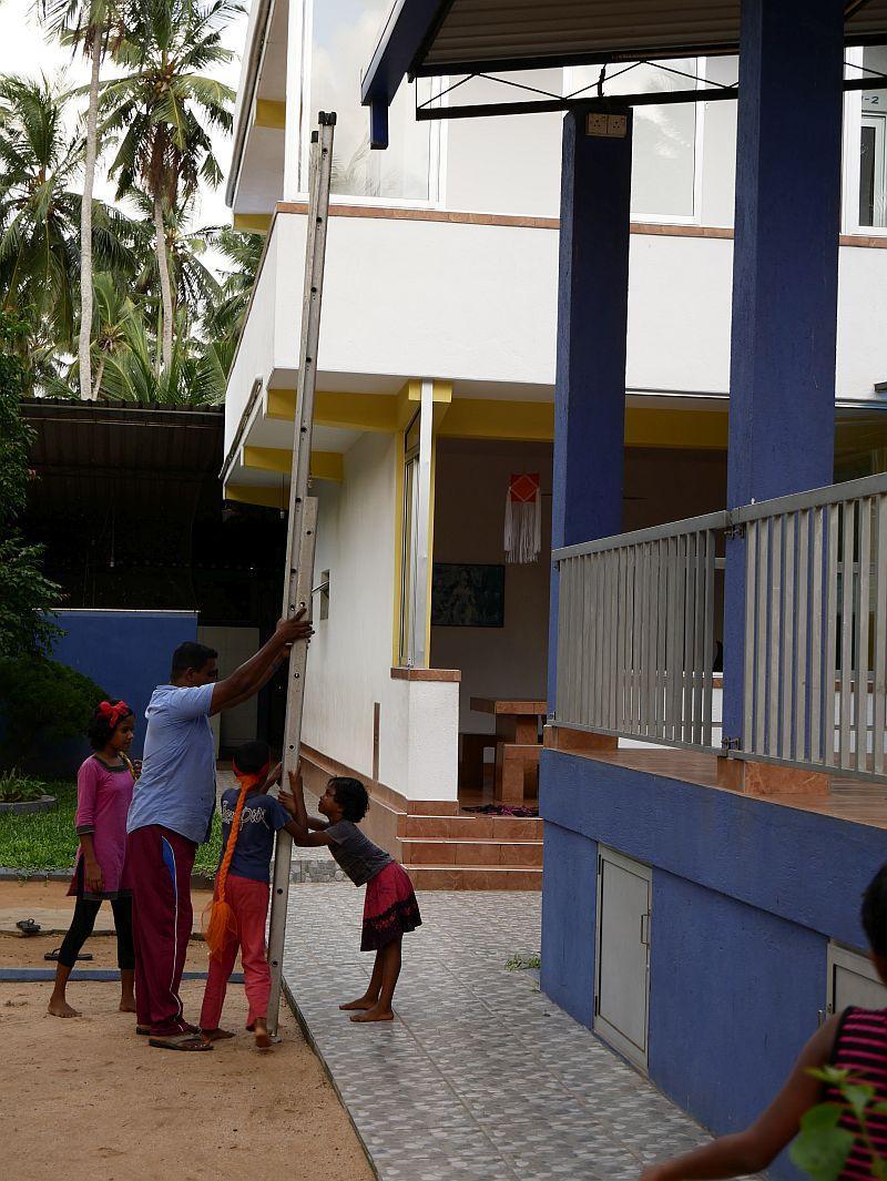 Ob die Kinder nun Elle oder Feuerball spielen, bei fast jedem Spiel werden die kleinen Tennisbälle mit viel Power quer durch den Garten geworfen. Wenn sich dann ein Ball zu den Nachbarn verirrt oder in einer Palme landet, ist das ganze leicht zu lösen. Liegt der Ball allerdings auf dem Dach in der Regenrinne, freuen sich die Kinder, den lieben Dissa um Hilfe bitten zu können und eilen hastig zu seinem kleinen Häuschen auf dem Gelände. Entspannt grinsend und ganz die Ruhe selbst läuft er dann zum Schuppen, um eine Leiter zu holen und die Ballrettung in Angriff zu nehmen. Allerdings klettert nicht er die Leiter hoch, sondern eines der Kinder. Das liegt übrigens daran, dass die Leiter ein kleines bisschen zu kurz ist und nicht ganz bis ans Dach reicht. Somit hält Dissa mit ein paar starken Mädchen die Leiter in der Luft fest damit eines der Kinder die Bälle aus der Regenrinne holen kann. Auf den ersten Blick ist das eine wackelige und gewöhnungsbedürftige Aktion, aber auch diesmal ist die Mission Ballrettung geglückt und es kann weiter gespielt werden!