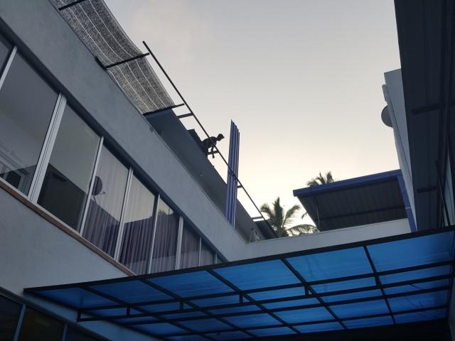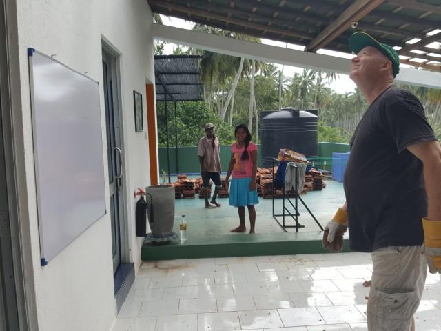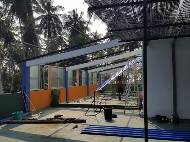 Die Unterkunft der Praktikanten hat ein neues Dach bekommen. Aber zuerst mussten die alten Ziegel runter, Dissa unser Fahrer und Mann für alles sass also am Donnerstag und nochmals am Freitag auf dem Dach und warf einen nach dem anderen Ziegel die 2 Meter hinunter, wo Frank sie auffing und sie ihre Reise durch unsere Transportkette antraten. Später am Nachmittag wanderten sie durch 60 Hände durch das komplette Angelshome hinunter auf den Vorplatz alle grösseren Mädchen, Angestellten und wir packten mit an und dann war die Bühne frei für die Bauarbeiter. Recht gemütlich gingen sie an die Arbeit. Nach einem Tag war, außer dass unsere Wasserpumpe keinen Mucks mehr von sich gab und überall Dreck, Holz und Metallstützen herumlagen noch nicht viele Anzeichen von Arbeit zu sehen. Wir wuschen uns also wie die Mädchen hier am großen Becken mit einem Eimer in der Hand und einem Tuch bzw weiten Kleidern um den Körper. Am Sonntag wurde die Wasserpumpe repariert aber von den Arbeitern fürs Dach keine Spur, obwohl heute gemäß Vertrag das Dach hätte fertig sein sollen. Gegen Mittag des nächsten Tages ließen sie sich wieder blicken und nachdem ihnen ordentlich eingeheizt worden war, war das Dach dann auch ruck zuck bis zum Montagabend fertig und unsere Unterkunft wieder wie neu.