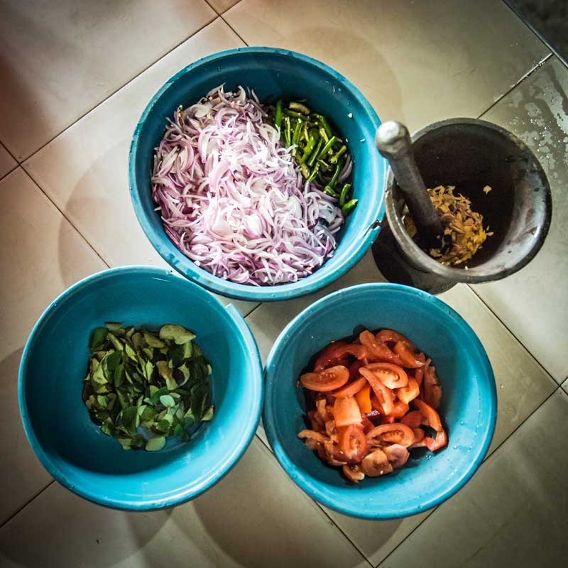 Die Hühnchenteile in einer Schüssel mit der Hälfte der Zwiebeln, Chilischoten, einem Teil der Curryblätter, Salz, Kurkuma, Essig, Pfeffer, Zimt, Bockshornklee, Chillipulver und Chiliflocken würzen und kurz marinieren.