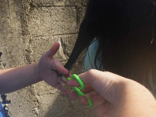Bewaffnet mit Kamm, Bastelschere und Kamera machten wir uns dann an's Werk. Die abgeschnittenen Haare wurden natürlich kritisch beäugt, aber nichtsdestotrotz waren beide mit dem Ergebnis zufrieden.