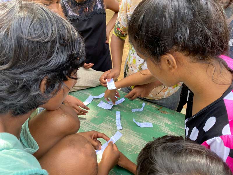 Am nächsten Tag wurde die Schnitzeljagd natürlich nachgeholt. Ich habe die Mädels in 3 Gruppen eingeteilt und dann ging es auch schon los. Es mussten immer abwechselnd Denk- und spielerische Aufgaben gelöst werden. Bei den Denkaufgaben mussten sie zum Beispiel Kreuzworträtsel lösen oder eine Geheimschrift entziffern. An der Geheimschrift hatten sie ganz schön zu knabbern. Sie hatten nur Zahlen und mussten herausfinden, dass diese die jeweiligen Buchstaben im Alphabet darstellen. Die Erste, die es herausgefunden hat, war Puimi, die Älteste unter den Mädchen. Die Spiele zwischendurch haben den Mädels besonderen Spaß gemacht. Einmal haben wir "Der Boden ist Lava" gespielt und jede Gruppe hatte nur 5 Papiere, auf denen sie sich fortbewegen konnten, um eine Strecke zu überwinden. Ein anderes Mal mussten sie die Strecke zum nächsten Hinweis mit zusammengebundenen Beinen überqueren. Dabei wurden alle Beine der Gruppe zusammen gebunden, nicht nur die der 2-er Pärchen. Das wäre ja langweilig gewesen! Natürlich sind die Gruppen oft zu Boden gegangen, aber zum Glück nur unter lautem Lachen!