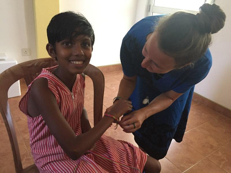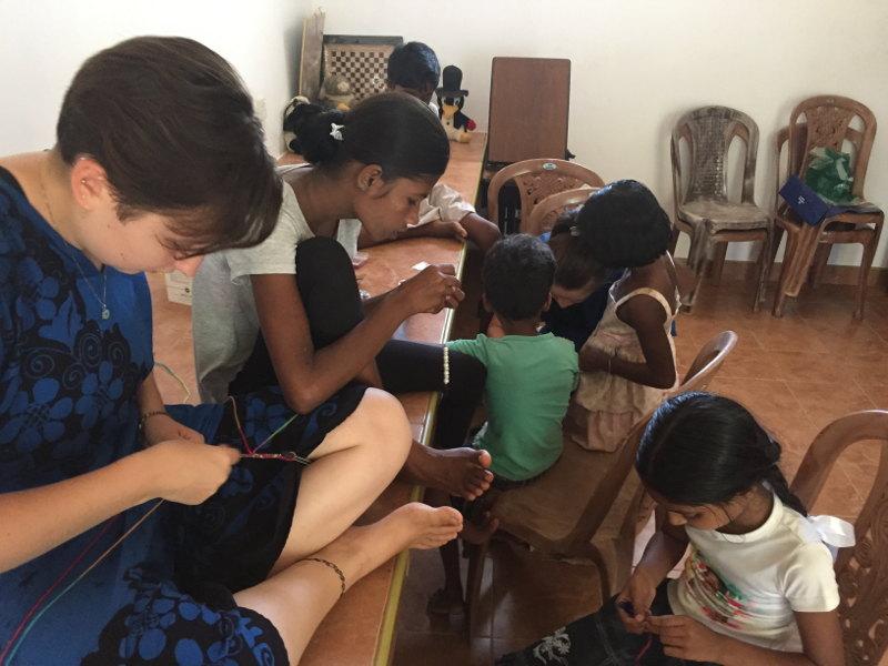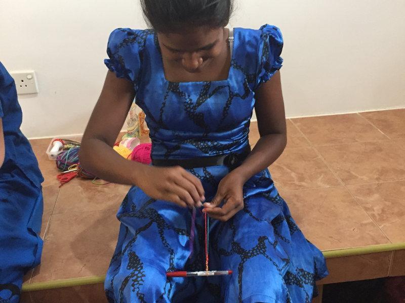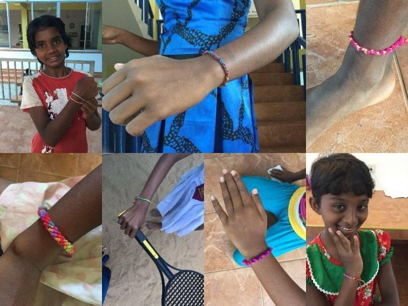 Eines der neusten Projekte von uns Praktikantinnen und die neue Lieblingsbeschäftigung der Mädchen während der Spielzeit ist die Erstellung von kleinen Arm- und Fußbändchen. Im Bastelraum des Angels Home gibt es eine Vielzahl von Wolle und Perlen. Das Meiste ist eine Spende von den Pateneltern der Kinder. Mit maximal 4-5 Kindern am Stück sitzen wir regelmäßig zusammen und Hanna, die besonders gut in verschiedenen Knüpftechniken ist, zeigt den Kindern geduldig wie sie selbst die schönsten Bänder zaubern können. Geschickt werden die Wollfäden auf Stifte gespannt und mit viel Geduld entstehen bunte Schmuckstücke. Nach einigen Tagen wimmelte es bereits auf dem Gelände des Angels Home von kleinen verzierten Hand- und Fußgelenken. Stolz zeigen die Kinder ihre Bändchen überall herum. In der Schule dürfen sie diese allerdings nicht tragen, jegliche Art von Schmuck ist dort verboten. Sobald sie jedoch vom Unterricht zurück sind schlüpfen die Mädels wieder in ihre süßen Kleider, machen sich schöne Haarspangen ins Haar und legen ihre selbst geknoteten bunten Bänder an.