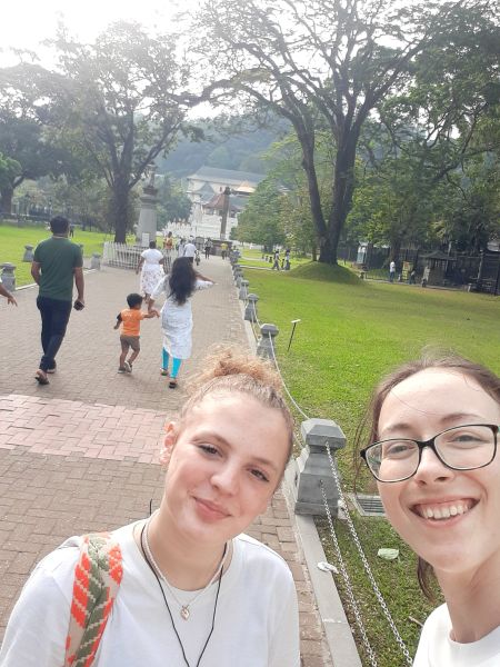 In Kandy angekommen, fiel mir sofort der hektische Verkehr von Bussen, TukTuks und Menschen auf. Doch der Vorteil war, dass es eine Fülle von TukTuks gab, sodass wir sofort eines nehmen konnten, um zum Zahntempel zu gelangen. Zuerst irrten wir jedoch am falschen Eingang umher, der nur für Einheimische bestimmt war. Schließlich fanden wir den richtigen Eingang für Ausländer, wo wir auch unsere Schuhe abgeben mussten. Der Zahntempel allein durch seine Struktur war beeindruckend und das Innere war prächtig. Ich konnte nur staunen über die Statuen, Schnitzereien und die reiche Geschichte, die dahinter steckte. Neben dem World of Buddhism gab es einen Elefantenplatz, wo wir zwei Elefanten sahen: Einen konnten wir füttern, den anderen beim Baden mit Kokosnussschalen helfen. Persönlich würde ich jedoch nicht mehr dorthin gehen, da die Elefanten angekettet waren und nur zur Unterhaltung der Touristen dienten. Daher würde ich lieber in einen Nationalpark gehen, um Tiere in freier Wildbahn zu sehen. Der Zahntempel lag am Kandy Lake, also machten wir einen kleinen Spaziergang entlang des Sees. Anschließend erreichten wir den Aussichtspunkt und konnten Kandy von oben betrachten. Danach besuchten wir die Buddha-Statue, die riesig war. Ich konnte es selbst erleben, indem ich eine Treppe hinter der Statue hochstieg, was einen unglaublichen Ausblick bot, ähnlich wie vom Aussichtspunkt. Der Hunger übermannte uns und wir machten uns auf den Weg zum Markt. Bevor wir essen gingen, machten wir ein wenig Souvenirs-, Kleidungs- und Früchteshopping. Im Café Enviro konnten wir dann etwas Vertrautes essen. Da im Kinderheim immer sri-lankische Küche serviert wird, war dies eine angenehme Abwechslung. Gut gestärkt machten wir uns auf zum Botanischen Garten. Der Garten war wunderschön mit seiner vielfältigen Farbenpracht. Ich fühlte mich in der Natur viel wohler als in der Stadt und genoss die Begegnungen mit den Affen, die uns mit ihrem Spiel unterhielten.