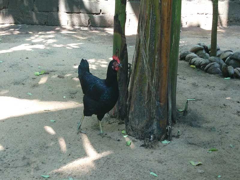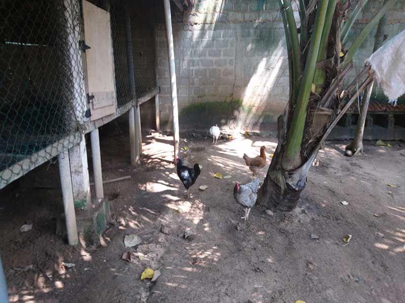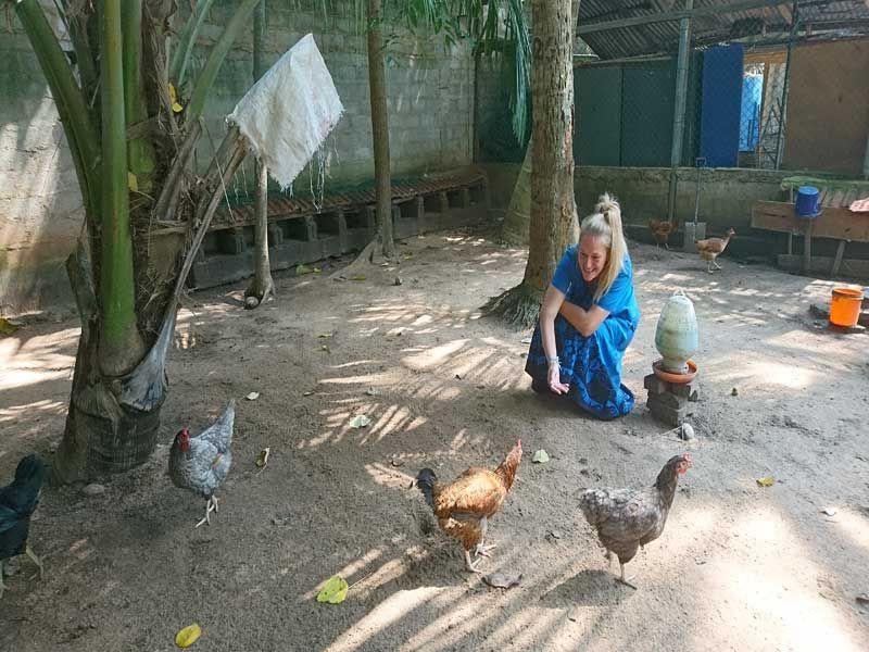 Mit einem „Nadine, Teaaa!" (Nadine, es gibt Tee!) wurde ich vor ein paar Tagen an meinen morgendlichen Tee zur Tee-Runde erinnert, den ich in meinem tierischen Vergnügen ganz vergessen hatte… Denn Achini, Sachini und Nishama erledigten ihre tägliche Hühnerfütterung und ließen mich daran teilhaben. Auf unserem Grundstück zwischen Spielgelände, Bühne und Klassenzimmer leben 8 muntere Hühner und 1 Hahn in ihrem eingezäunten, großen Gehege. Zumindest befinden sie sich innerhalb des Geheges, wenn sie nicht wieder entwischen, indem sie frech über den Zaun fliegen. 😊 Dann kommt es auch vor, dass man sie auf dem Spielgelände antrifft, oder der Hahn stolz auf der Mauer zum anliegenden Grundstück stolziert, während wir versuchen, ihn wieder auf unser Grundstück zu scheuchen. 😊 Allgemein sind die Hühner nicht sehr scheu, beim Füttern liefen sie mir sofort entgegen und haben aus der Hand gefressen.