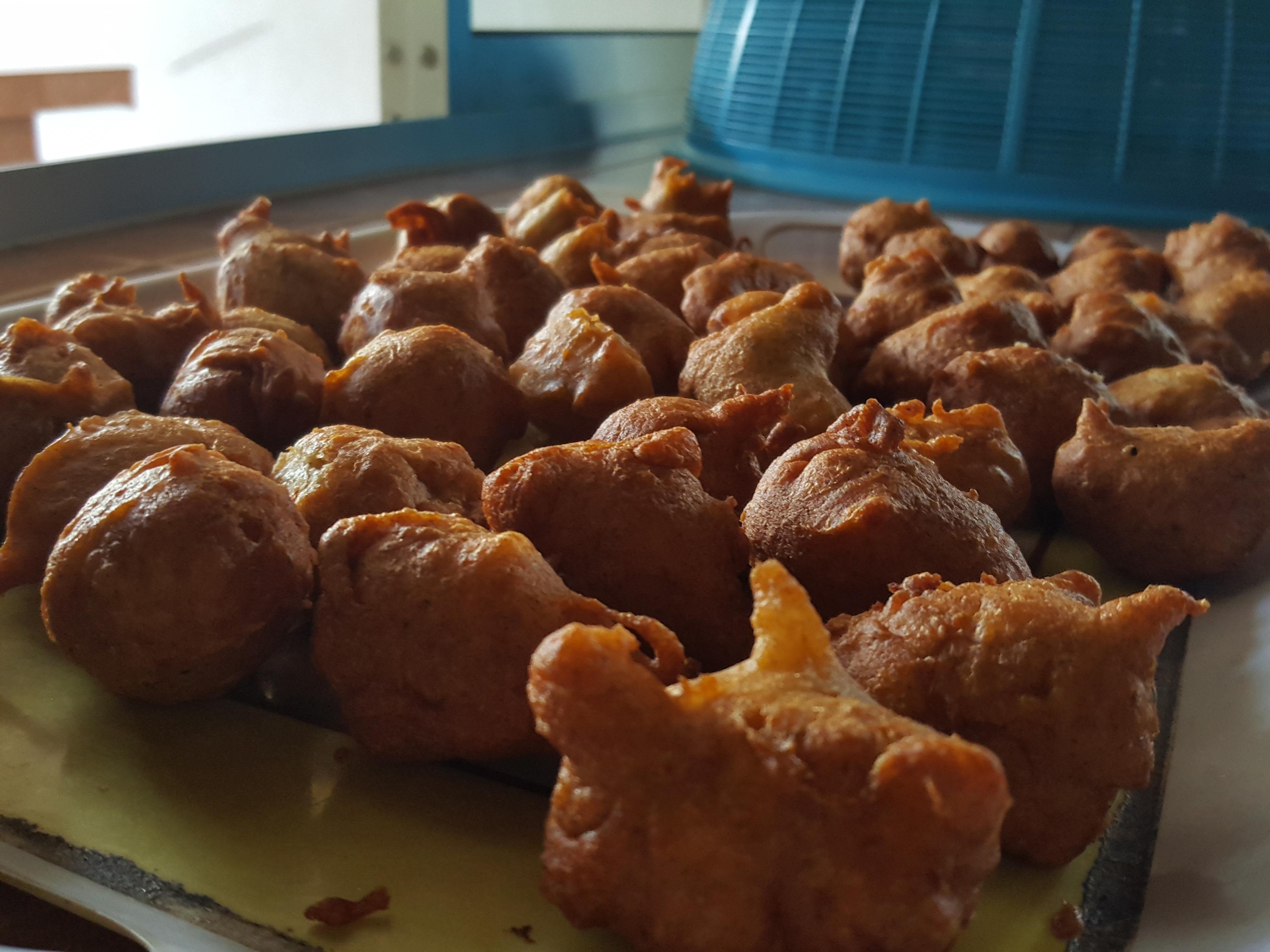 Man mengt einen dickflüssigen Hefeteig aus den Zutaten, lässt ihn mindestens eine Stunde lang gehen und backt den Teig dann in kleinen ca Esslöffel großen Portionen im Öl aus.