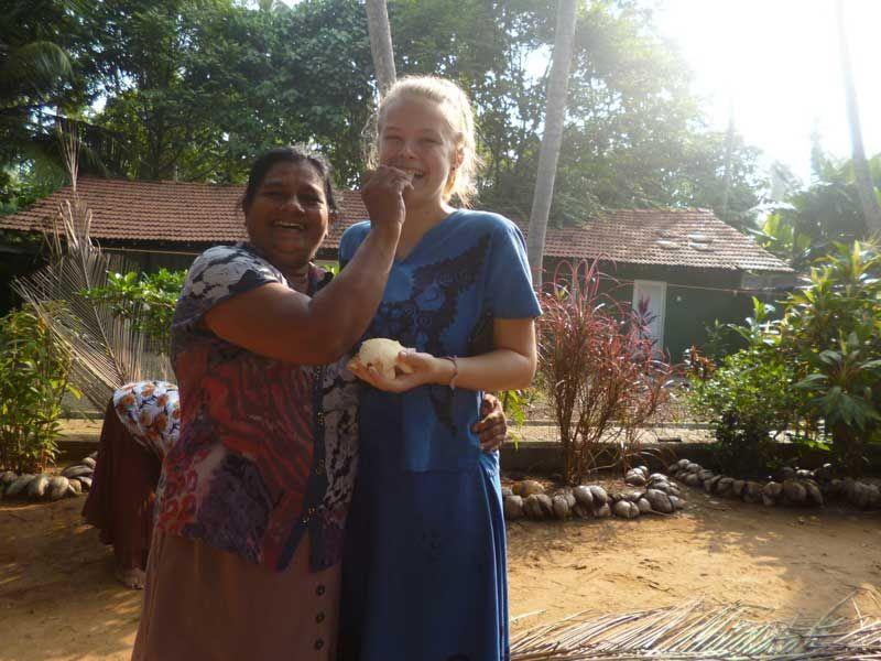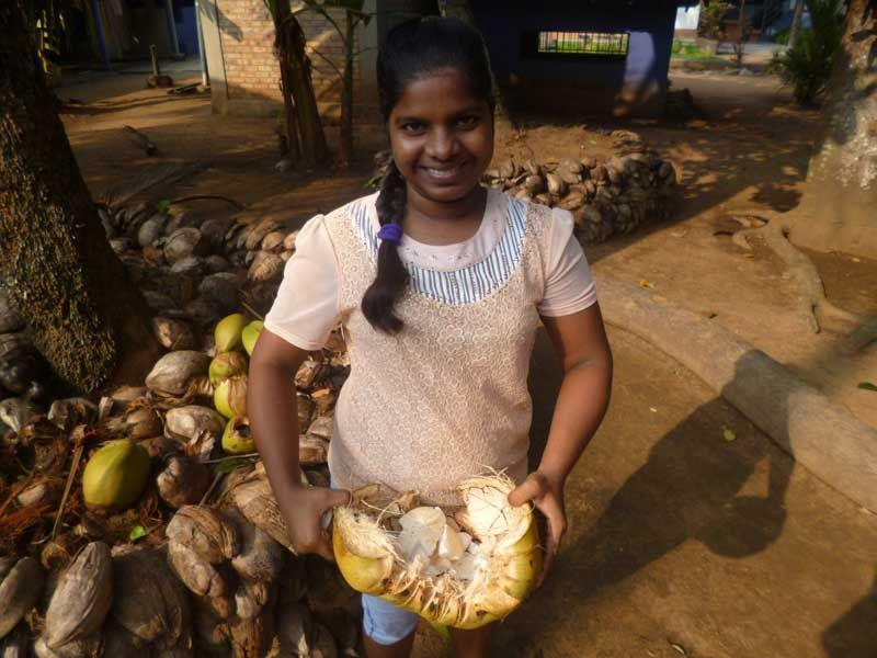 Eigentlich wollte ich nur ein paar Stückchen von der Kokosnuss essen, doch Shashikala drückt mir gleich die ganze Kokosnuss in die Hand und sagt mir, dass ich sie haben kann, das lasse ich mir natürlich auch nicht zweimal sagen!